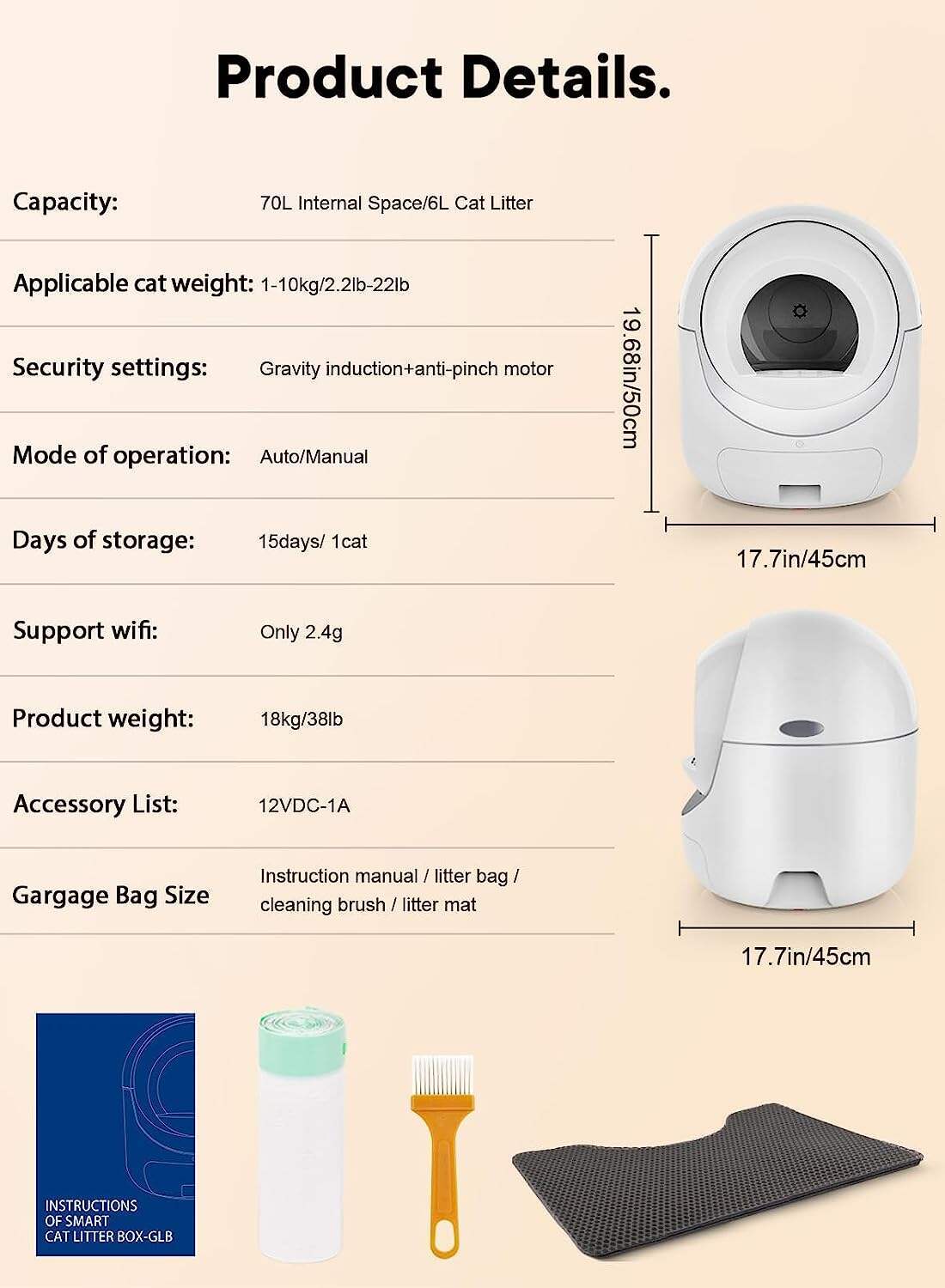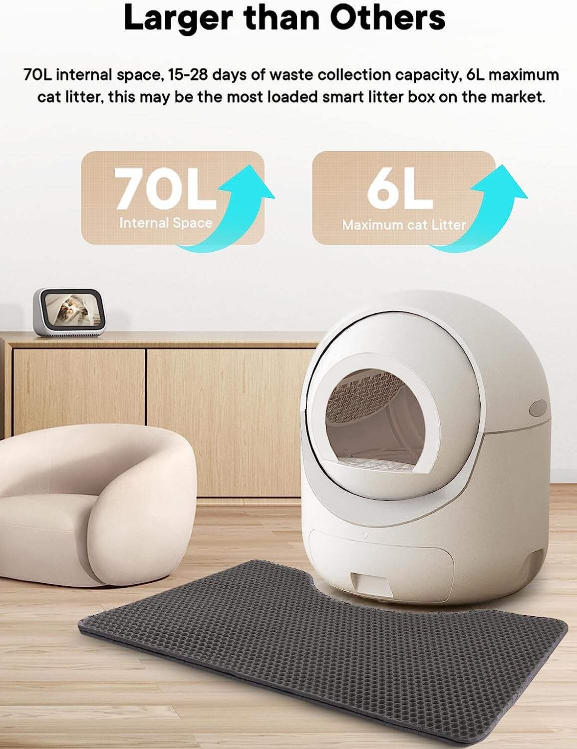 - Large Capacity: Automatic Cat Litter Box, has a internal space of 70L, a trash collection box of 15L. Maximum support 6L of cat litter, enough to use 15-28 days. Automatic Cat Litter Box, is suitable for cats weighing between 2.2lb to 22lb. Available for almost all cats
