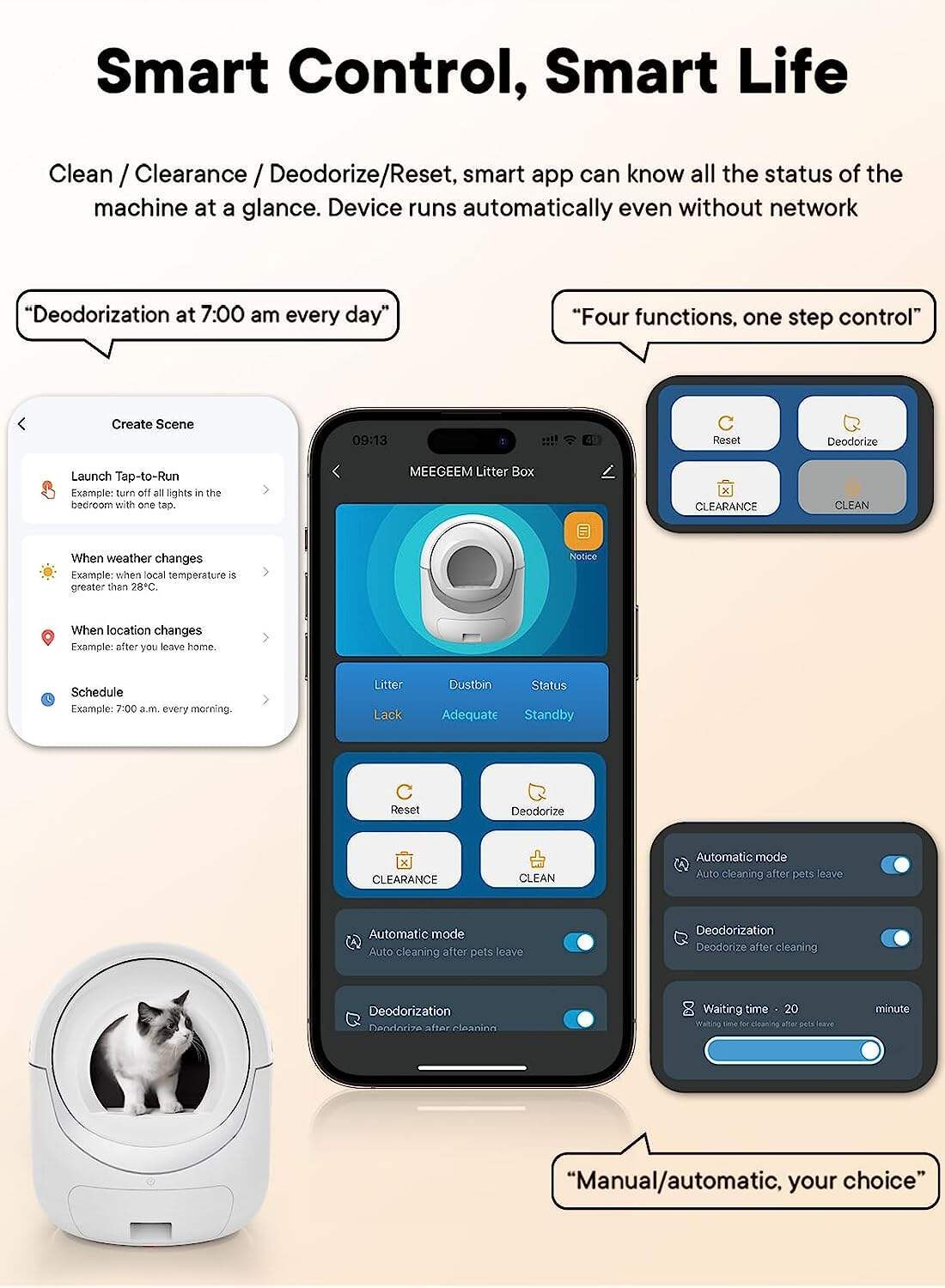 - Smart Control: Smart litter box, supports remote operation via Wi-Fi link app, you can check the remaining amount of litter/remaining space in the litter box/machine status in the app. All running messages will be sent to your phone through the app. Equipped with smart chip, Smart Litter Box can works without network.