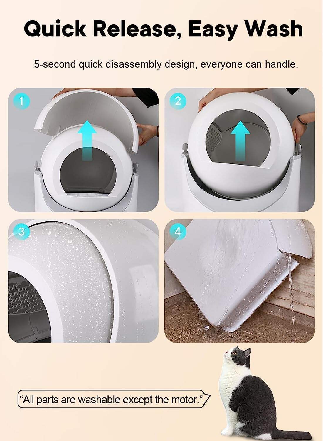- Easy Clean & No Odors: Litter Robot, with 5-second quick disassembly design, can be washed easily. High-tech deodorization design, no more leaks, no more odor. Use of product-specific mats (included in the package), cats do not bring litter into the house.