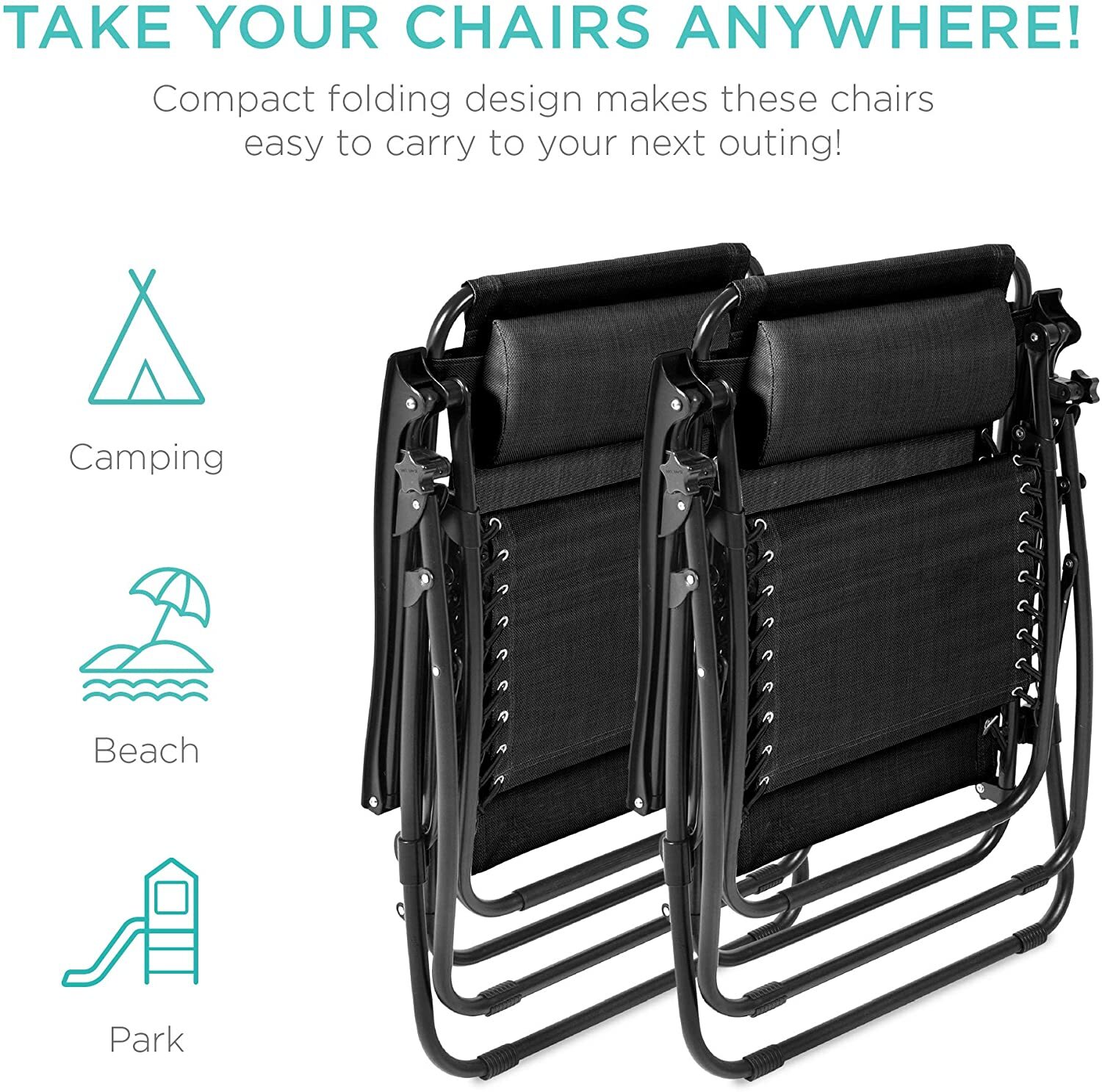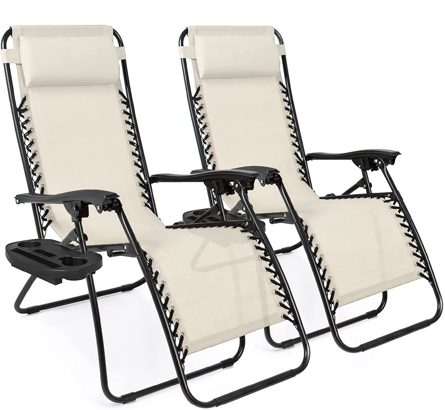 • Set of 2 Adjustable Steel Mesh Zero Gravity Lounge Chair Recliners w/Pillows and Cup Holder Trays