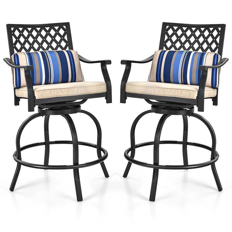 Are you looking for a patio bar height chair set for your outdoor place? This set of 2 swivel bar height chairs will expand both your living and entertaining space outside your home. These outdoor swivel chairs are constructed of sturdy steel frames with rust-resistant powder coating. 360° swivel design and 15° rocking design for extra comfort. Other than that, the breathable fabric filled with high elastic cotton is comfortable and fade-resistant for long-term use. The ergonomic backrest and armrest with reasonable height can relieve your fatigue instantly. This weather-resistance bar height chair set with a simple design is suitable for both indoor and outdoor use. You can place them anywhere you want without worrying about the sun or rain damage to the chair.