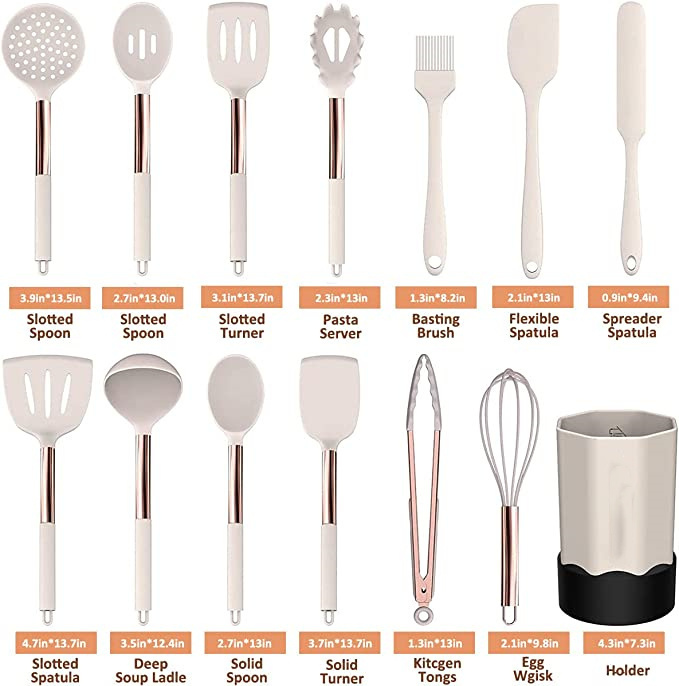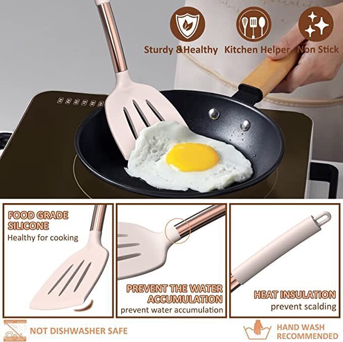 a PREMIUM QUALITY KITCHEN TOOLS DESIGNED TO LAST A LIFETIME Soft food grade silicone head prevent from scratching your cookware such as nonstick pots and pansand, no rust long copper stainless steel handle protect your hands from being scalded. No more worries about melting or rusty kitchen utensils! Our kitchen gadgets are polished with a special top-grade oil for longer time using not bend, break or rust