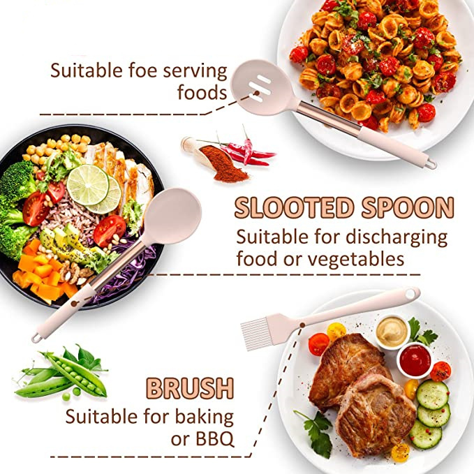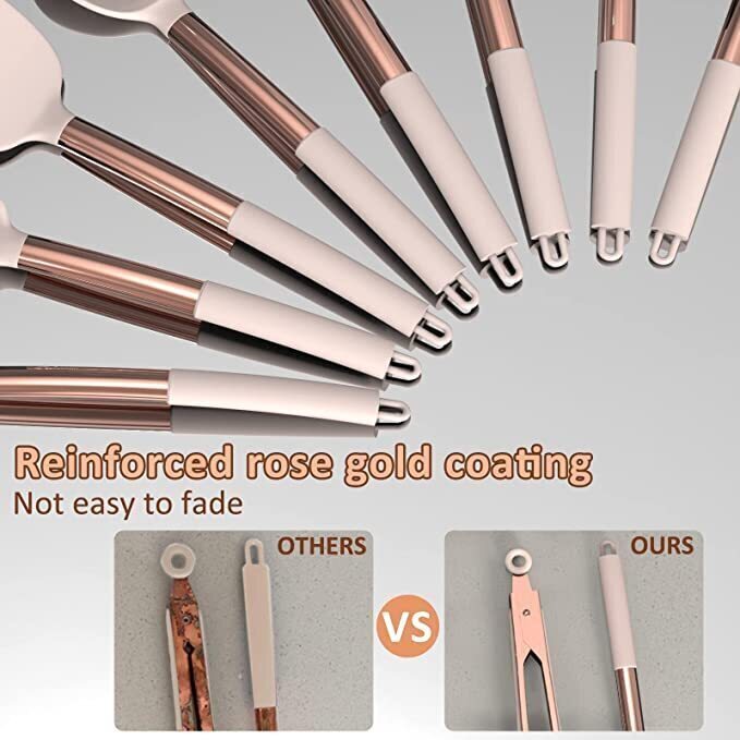 e UNIQUE DESIGN & FOOD GRADE MATERIAL Comfortable rose gold stainless steel handle look more elegant and noble. food grade silicone that are free of toxins and corroding particles. handles and balanced weight make cooking a joy and their large hanging holes help keep your cookware set orderly and organized