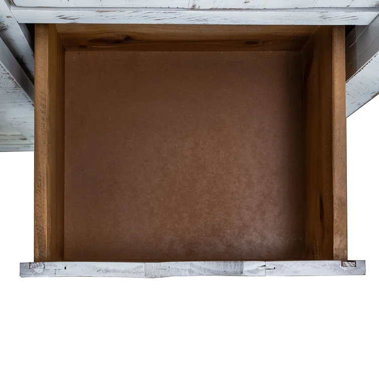 Finished in white lacquer with distressed markings throughout wood for antique appeal. The top features a brown finish for rustic aesthetic that blends well with a variety of home themes.