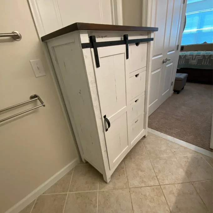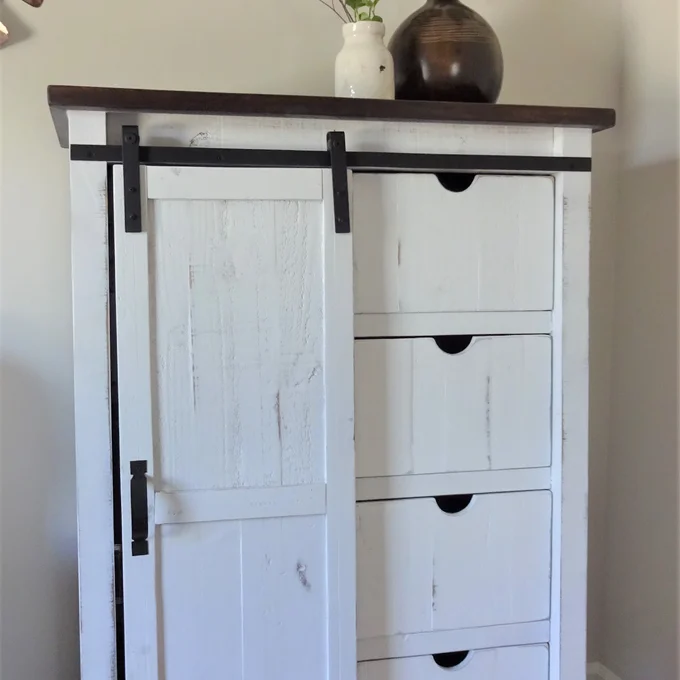 Features a barn styled door and four open shelves behind the door for storing your favorite clothing or your linens. -Includes Four Drawers and One Cabinet -Three Shelves Behind Cabinet -Barn Doors -Black Metal Accents -Constructed of Hardwood Solids, MDF, & Plywood -Distressed Markings -Brown Top