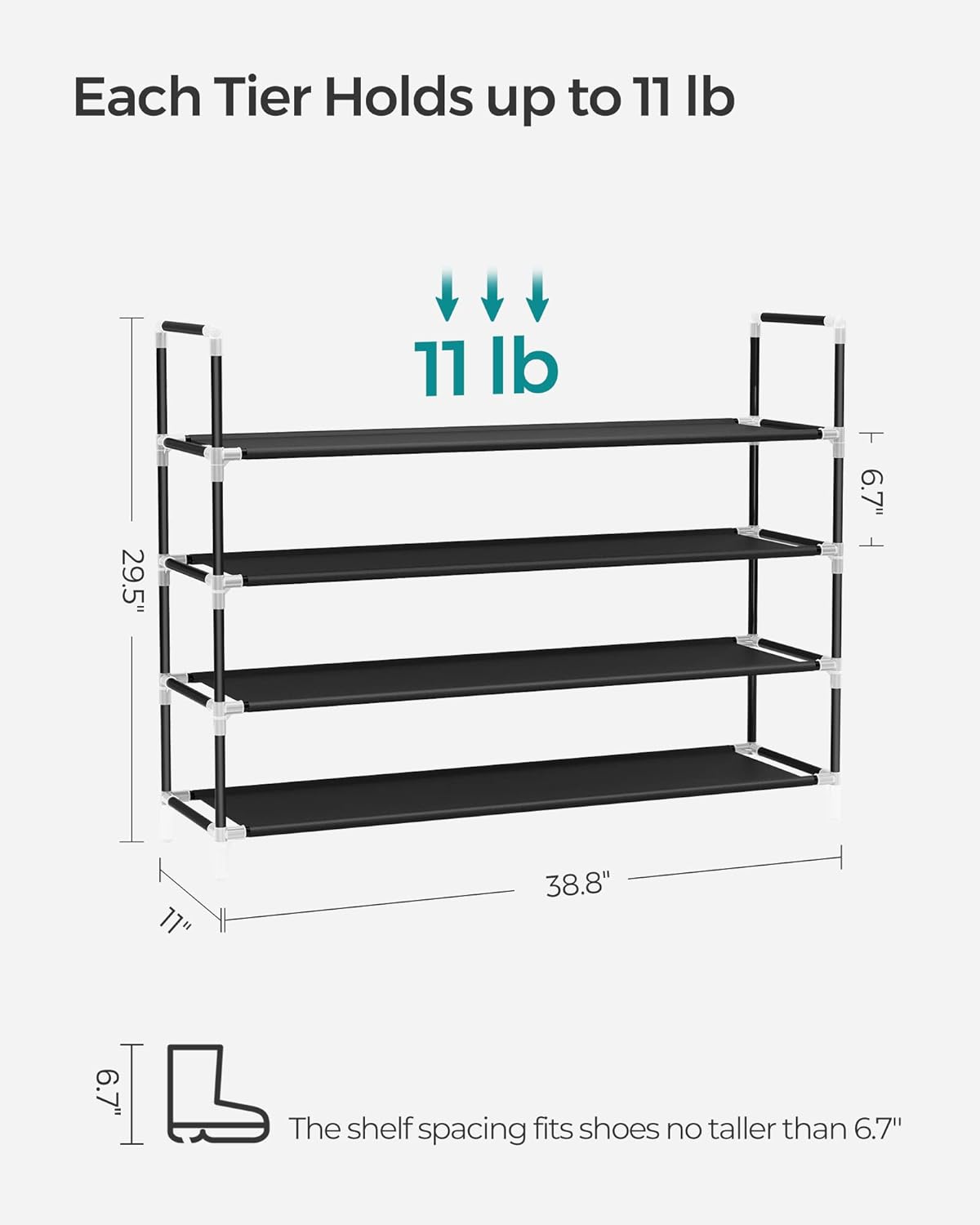 - [Space for Every Pair] With a length of 38.8'', 4-5 pairs of shoes can comfortably sit on each shelf, totaling to 16-20 pairs. The 6.7'' spacing between the shelves allows you to store any type of footwear, from sneakers to high heels