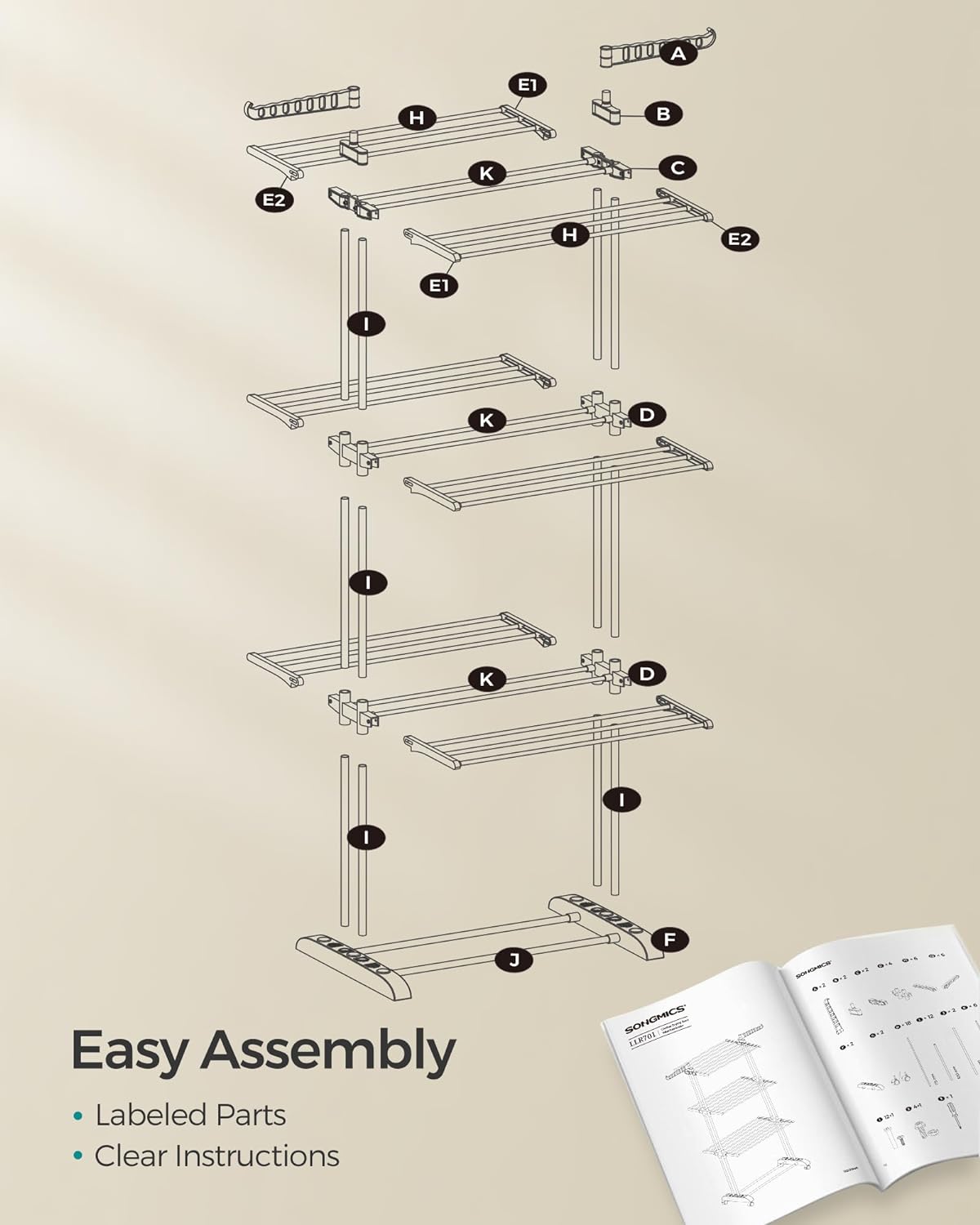 - [Hassle-Free Assembly] Don't sweat the setup. Our clear instructions and labeled parts will guide you to have your clothes drying rack ready in just 10 minutes
