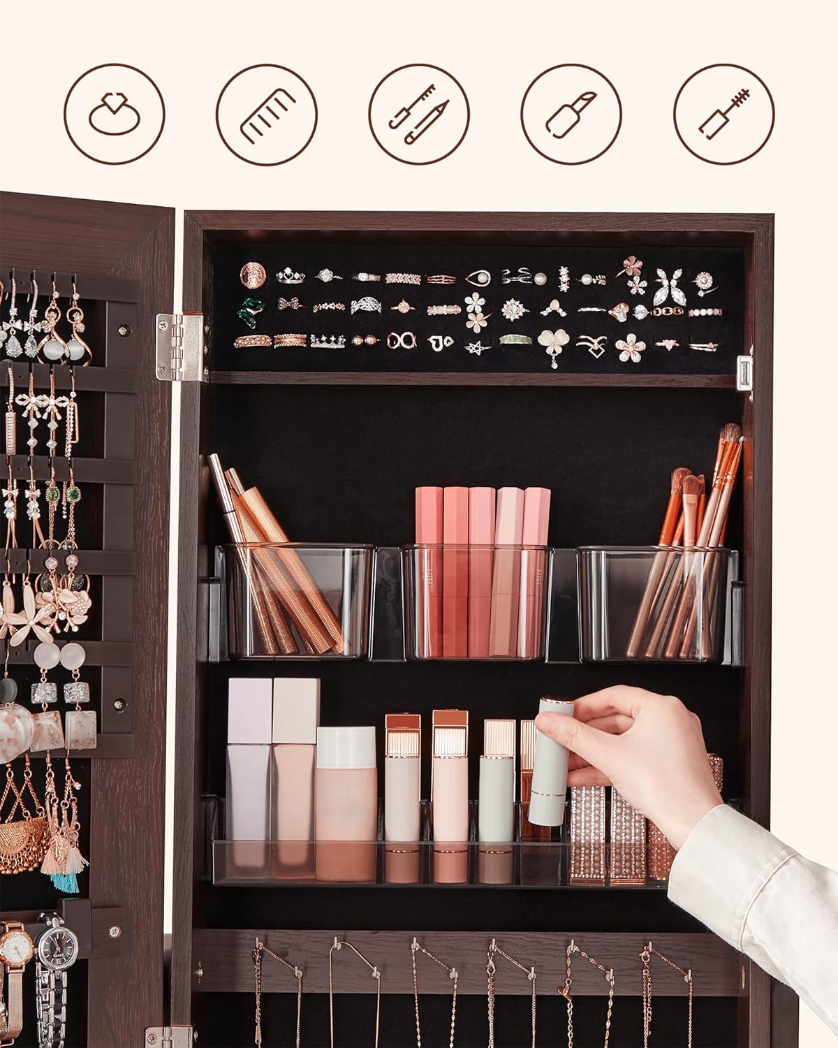 - Even for Cosmetics? Yes! There are 2 removable, easy-to-clean plastic cosmetic trays that contain 3 deep compartments for brushes, 2 compartments for powders, and 8 slots for lipsticks—a perfect 2-in-1 organizer for makeup and jewelry!