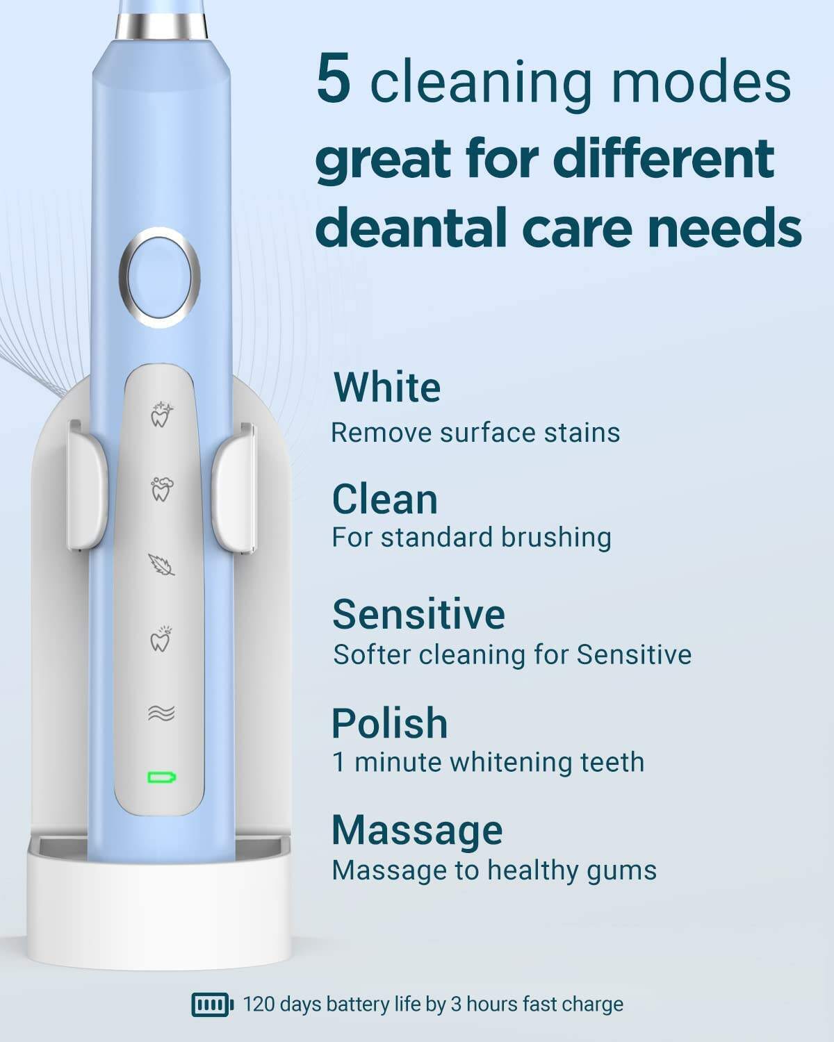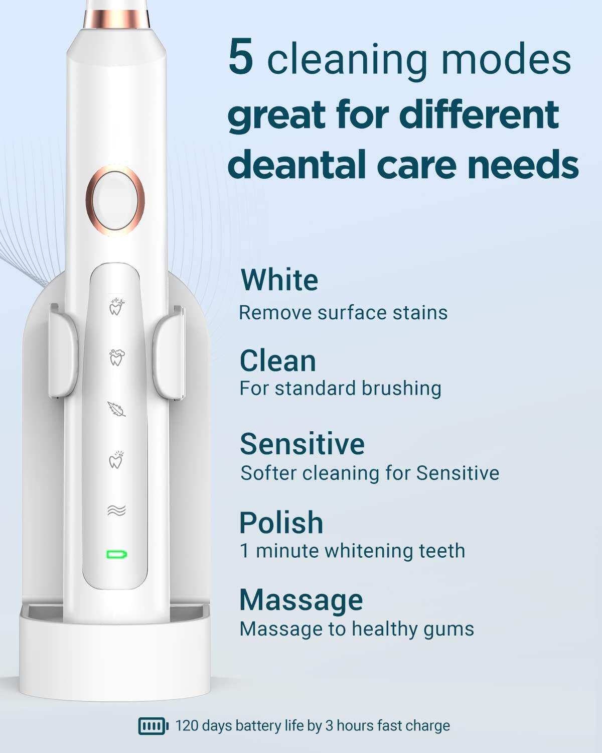 - 🪥5 Brushing Modes for All Oral Care Needs: Our rechargeable electric toothbrush for adults offers 5 different brushing modes, including cleaning, whitening, sensitive, gum care, and massage, to cater to different cleaning and care needs. You can also turn off the electric toothbrush in any mode by pressing the button for 2 seconds.