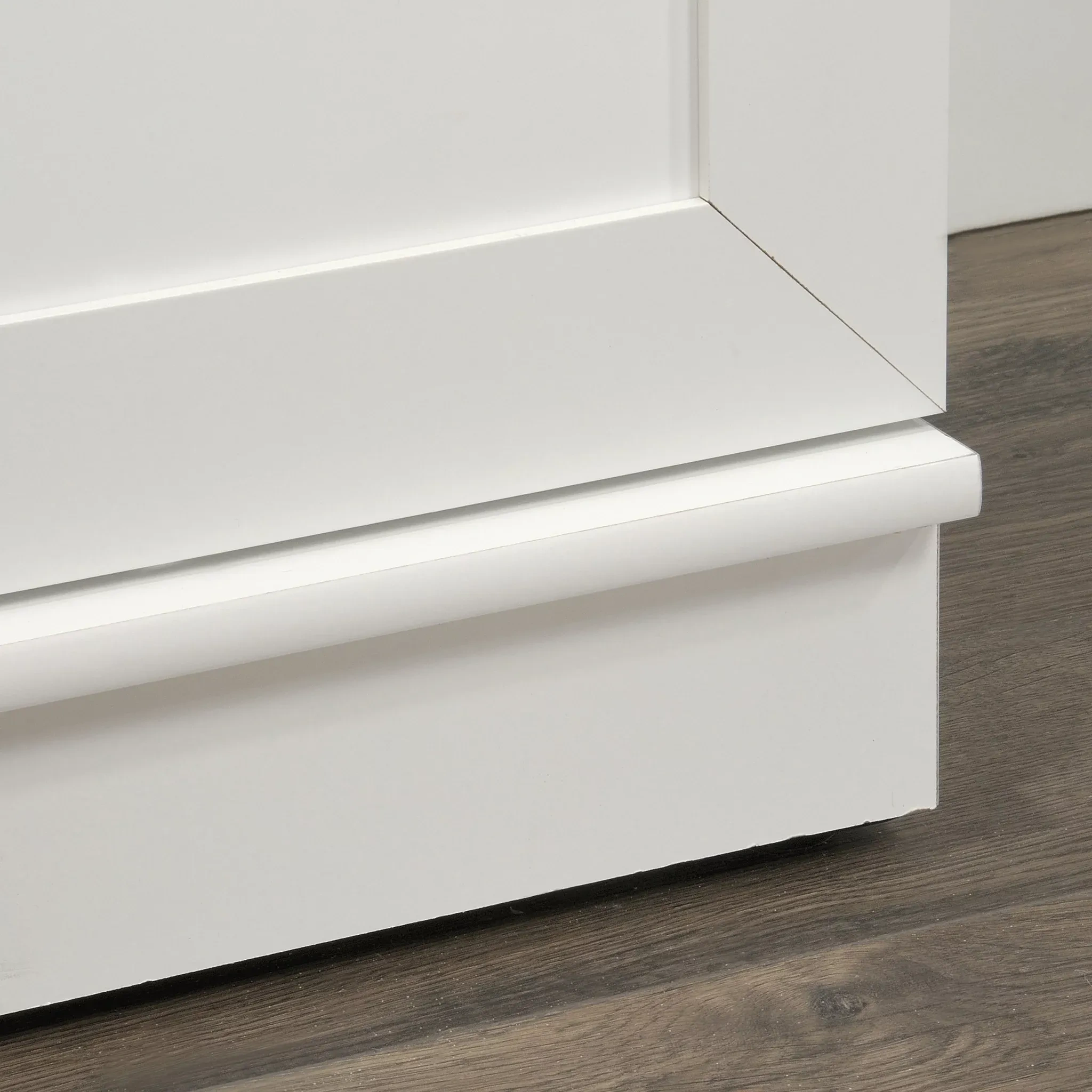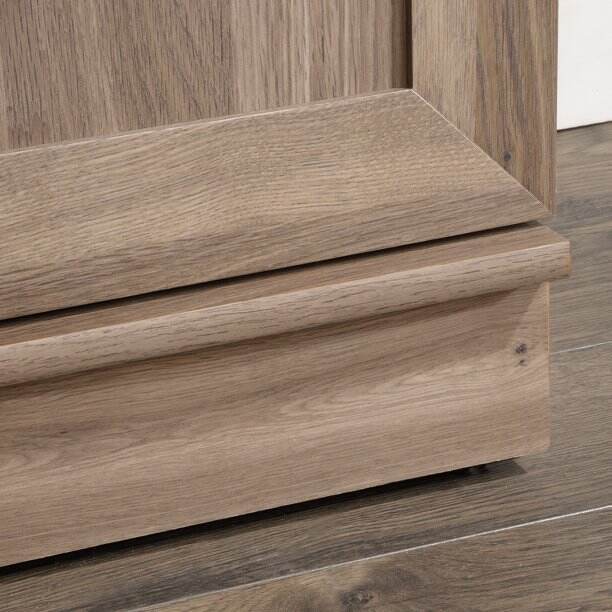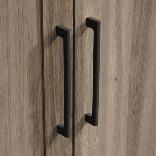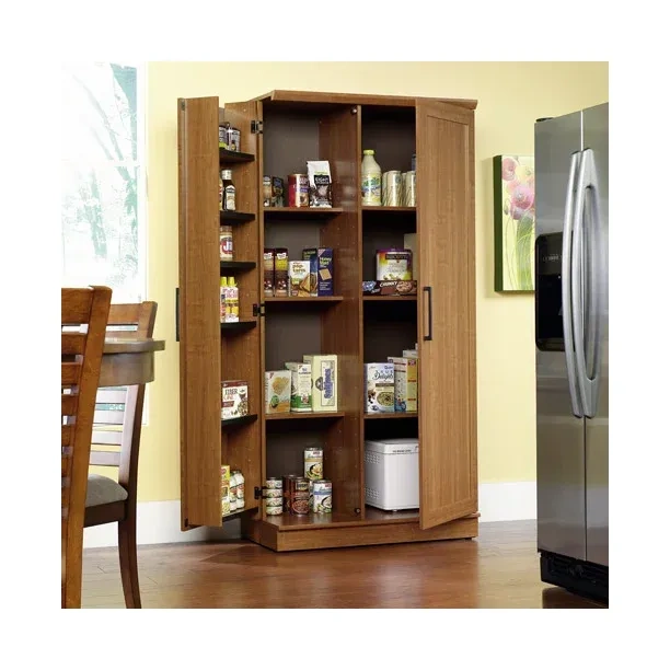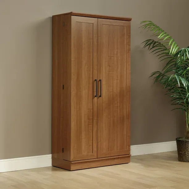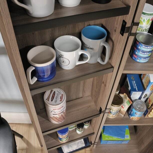 The outward opening door of this kitchen storage cabinet can be fixed on the left or right side according to your needs. Never worry about storing items that are too big or too small. Wire access through the rear panel provides a convenient path for wires. Adjustable base levelers ensure your pantry stays level, even if the floor isn't. Crafted from chic Dakota Oak, this beautiful storage cabinet is the solution to your storage needs.