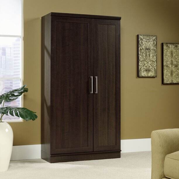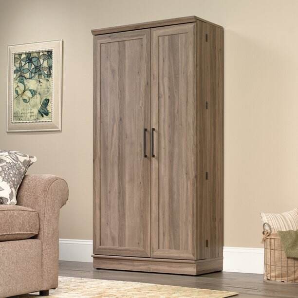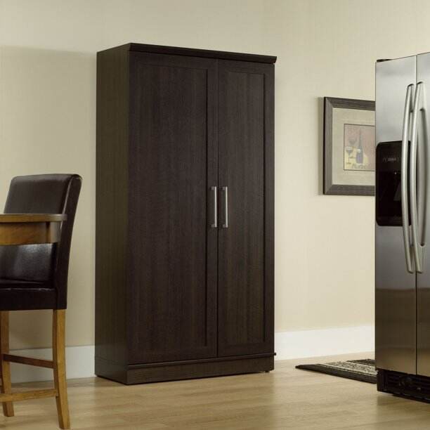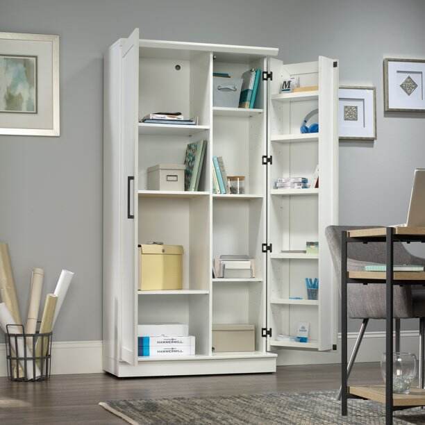 - Two adjustable shelves and one fixed shelf sit behind each door in our storage cabinet