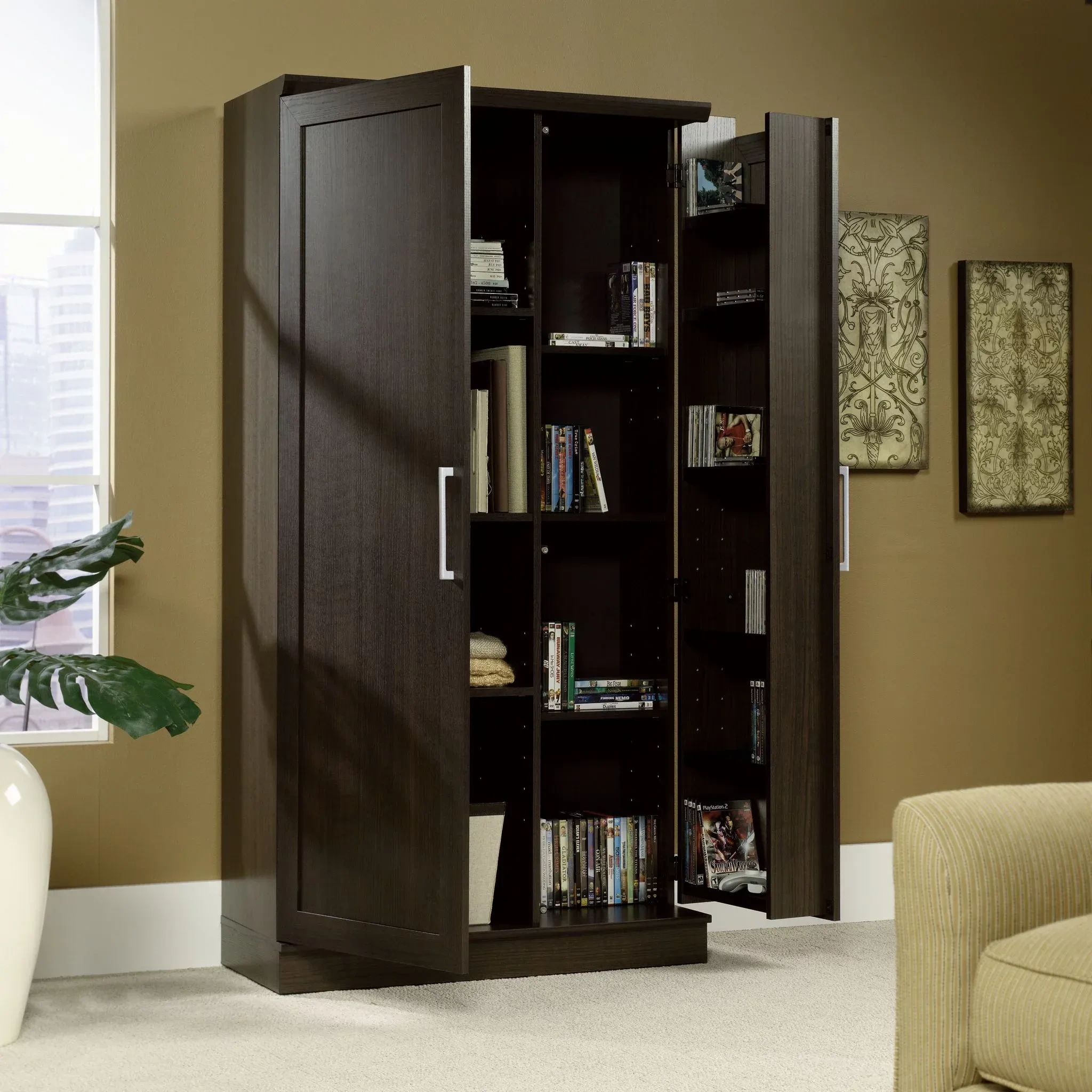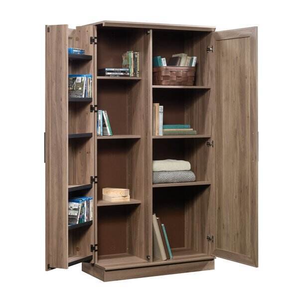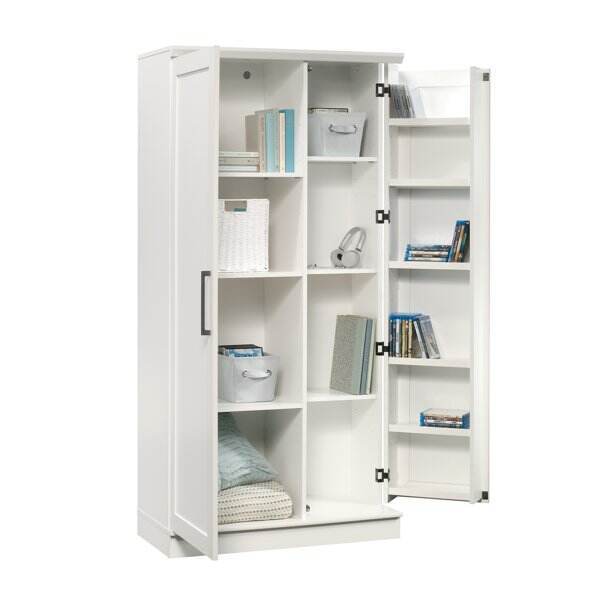 Behind each framed panel door are two adjustable shelves and one fixed shelf for customizable storage options for office supplies, pantry items, garage tools and more. Small doors include swing-out storage with three adjustable shelves and three fixed shelves - talk about storage!