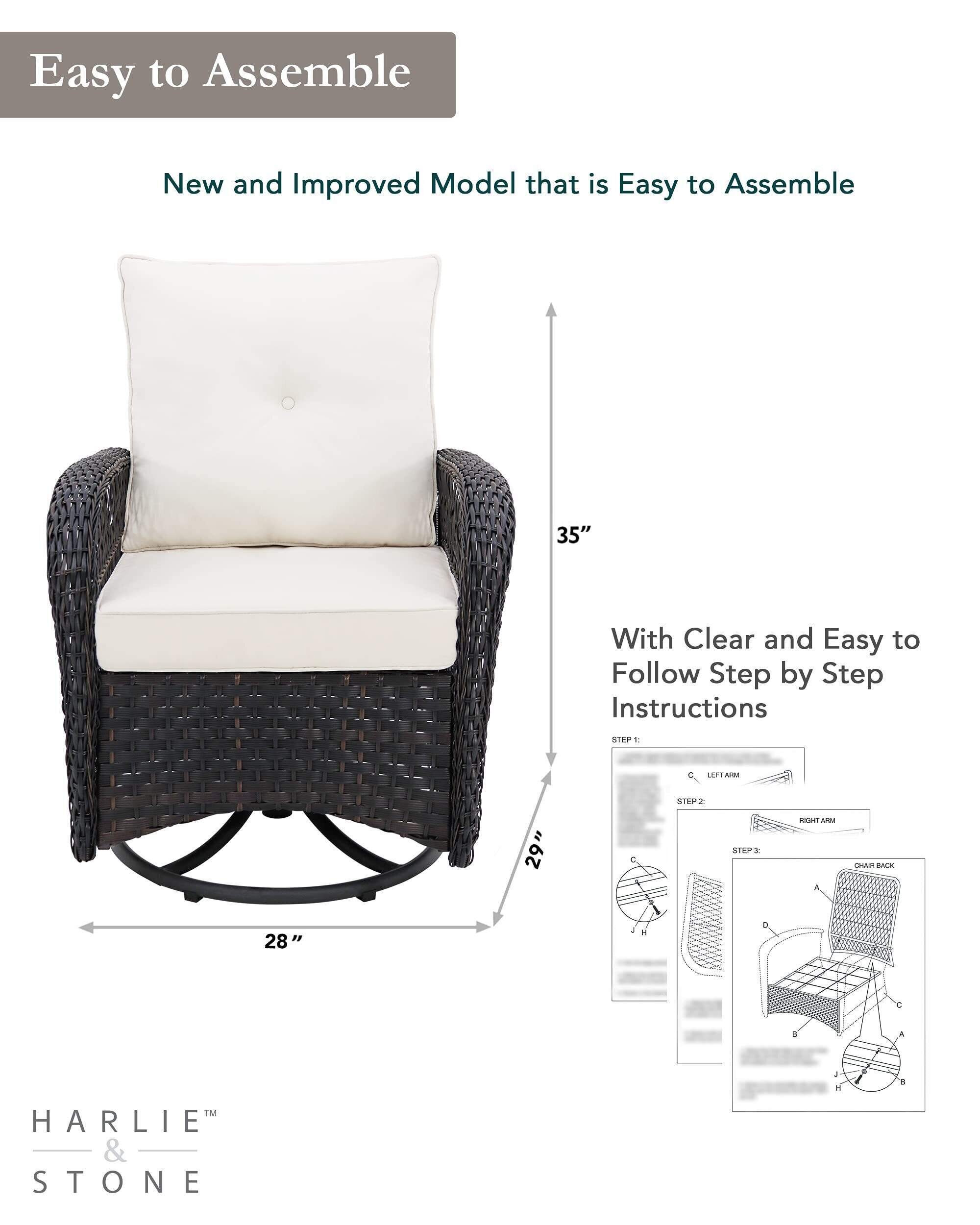 - EASY TO ASSEMBLE: Rest assured that you will have lots of help on hand while putting this outdoor swivel rocker patio chairs set together. We provide not only a clearly written, easy to follow step by step instruction manual, we also have a full instructional video which shows us putting the set together for you to follow along. This outdoor furniture set includes 2 chairs with back and seat cushions and a matching side table with tempered glass. Please note - Decorative pillows are not included with purchase.