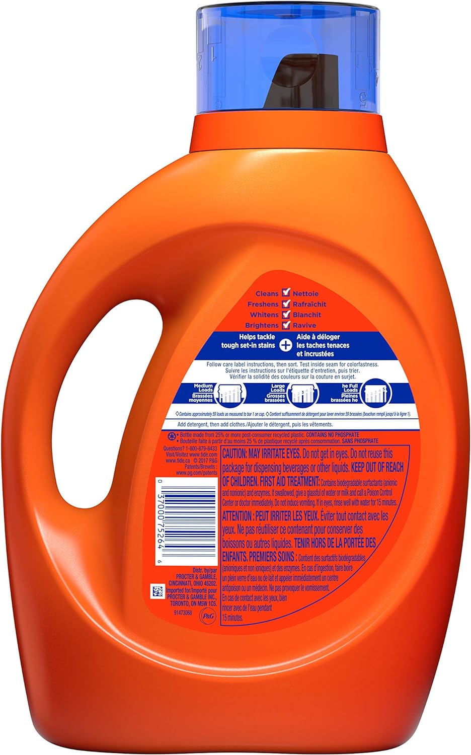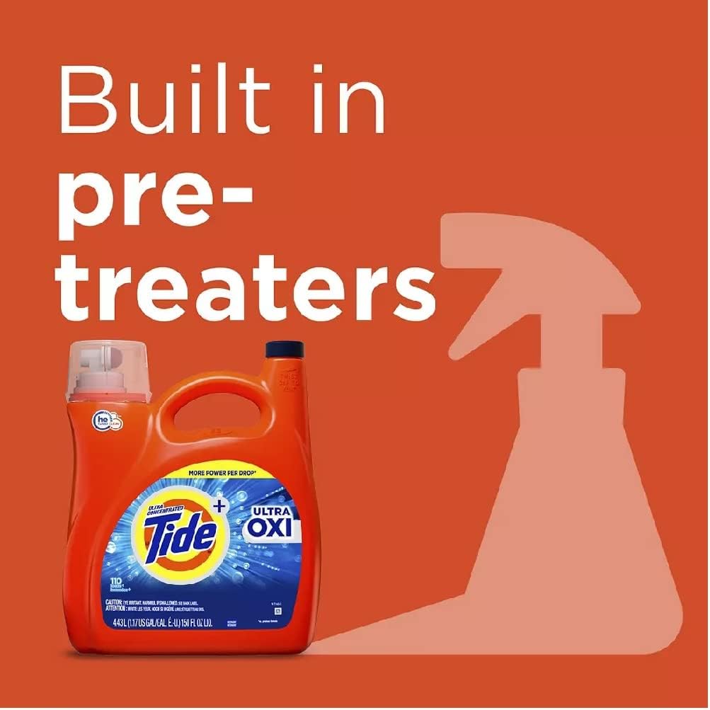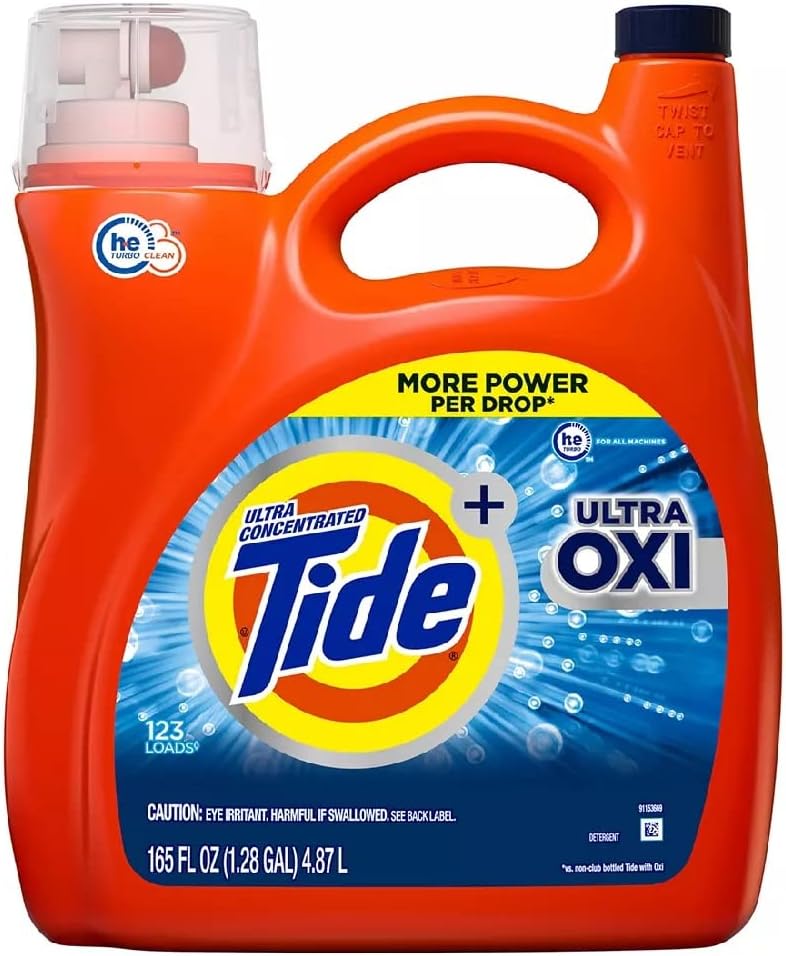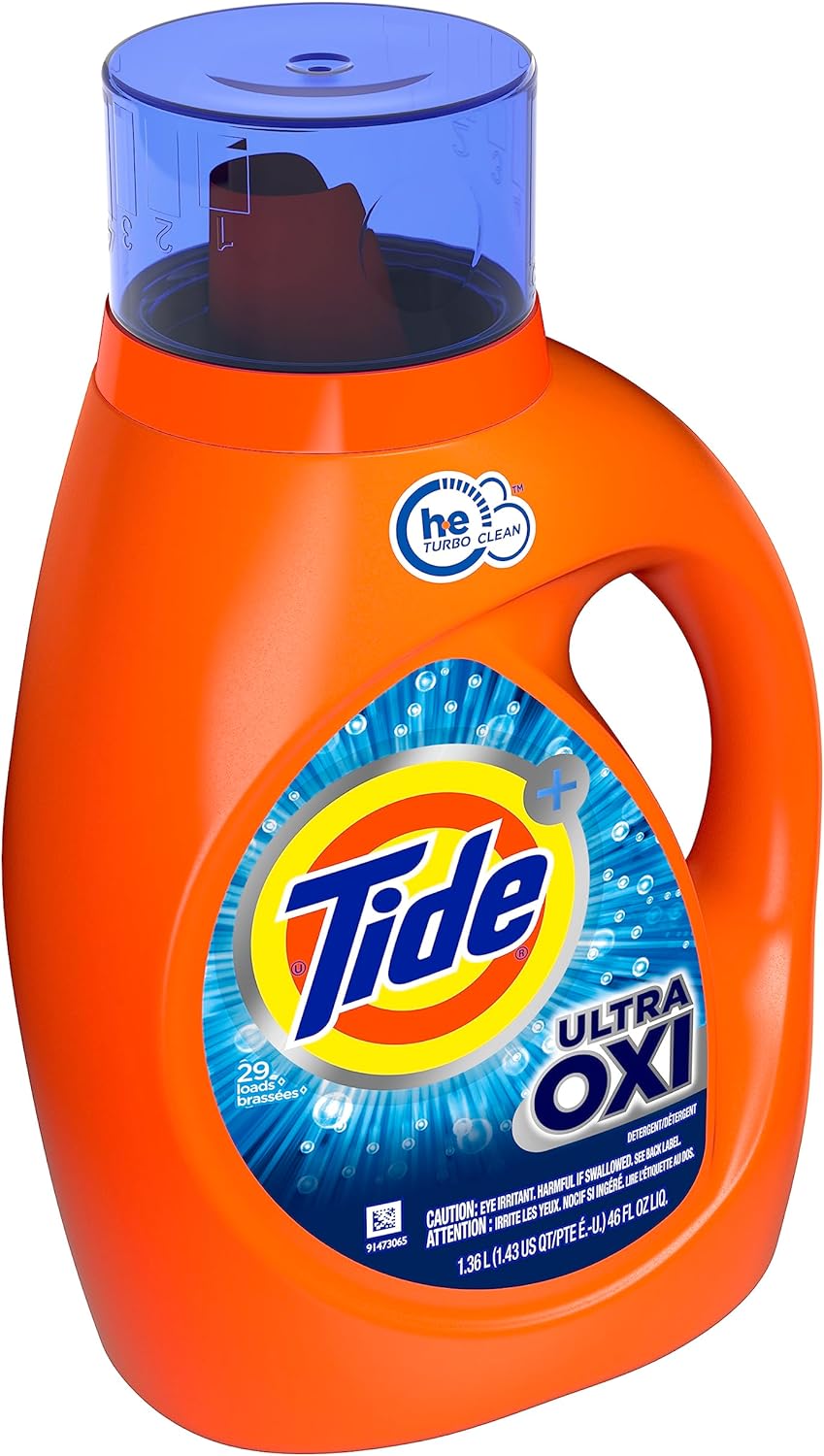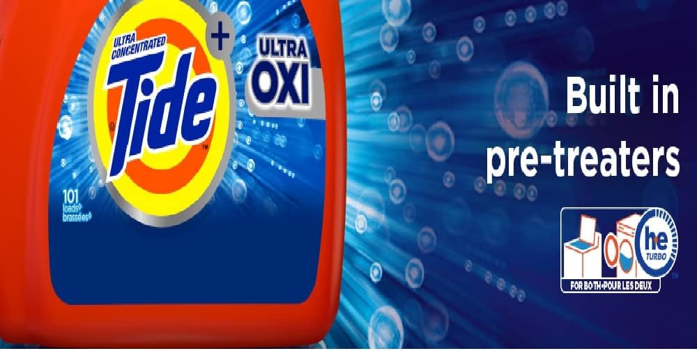 Tide Ultra OXI liquid laundry detergent provides built-in pre-treaters to remove even the toughest stains. It is now more concentrated to provide more stain removal and freshness and less water*. From America’s #1 detergent brand,** to cover your many laundry needs. Also try our small but powerful Tide PODS laundry pacs. Measure your loads with cap. For medium loads, fill to bar 1. For large loads, fill to bar 3. For HE full loads, fill to bar 5. Add clothes, pour into dispenser, start washer. * vs. previous formula ** Tide, based on sales
