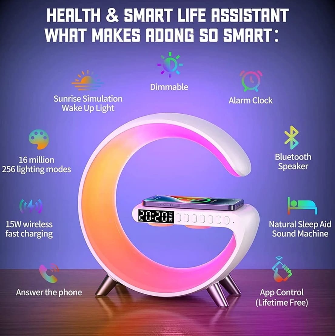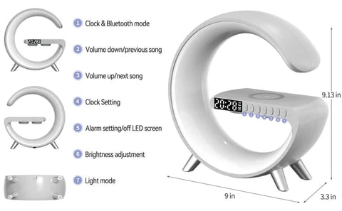 The feature list includes a clock, 15W fast wireless charging, Bluetooth speaker, sleep lamp, sunrise alarm lamp, and a dazzling light effect. Take leave of dangling and tangling charging cables since it is a wireless station.