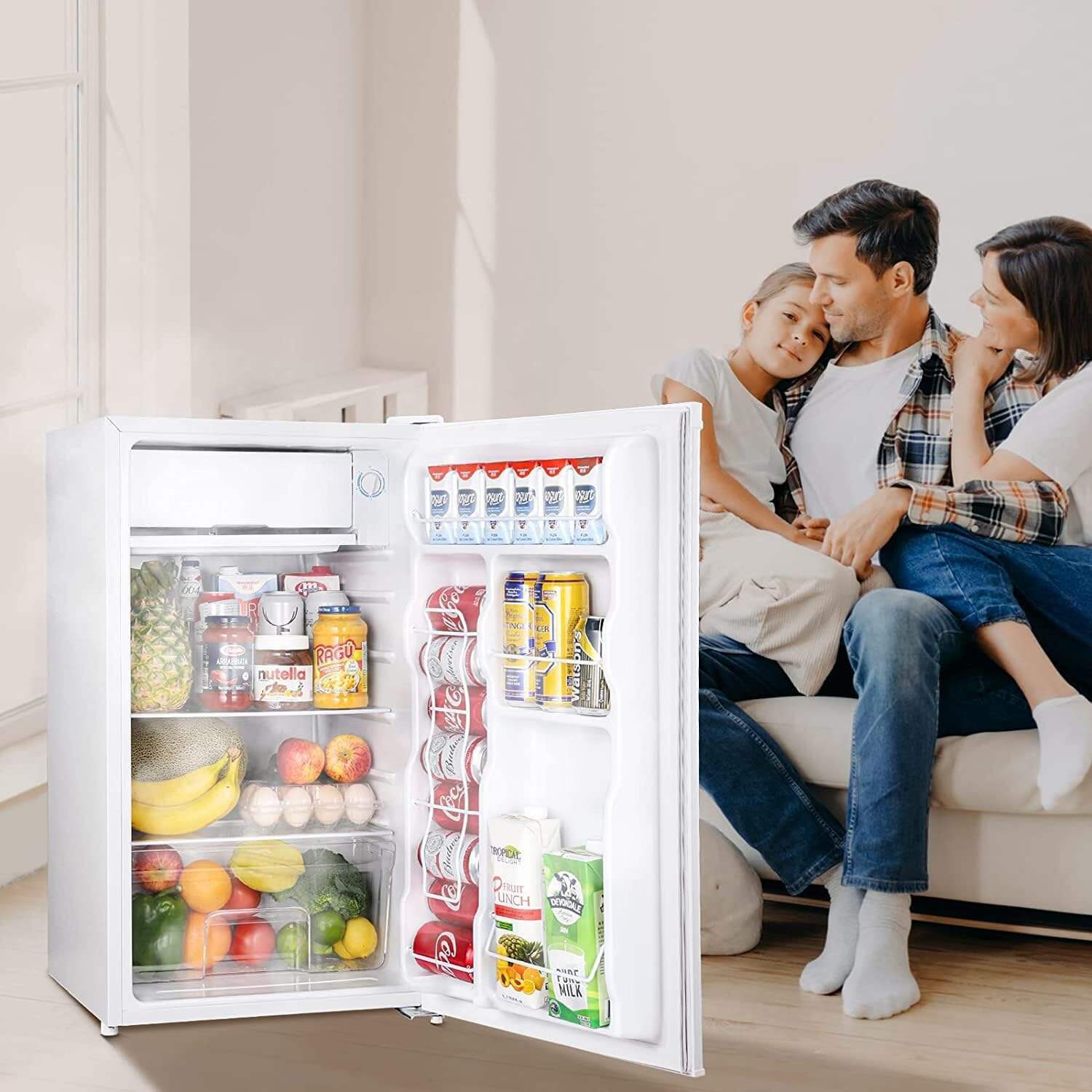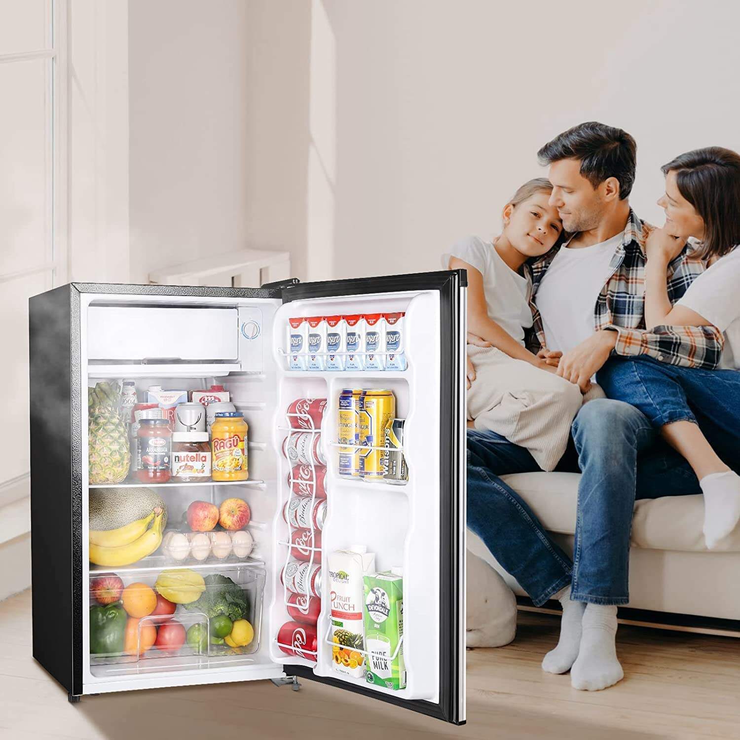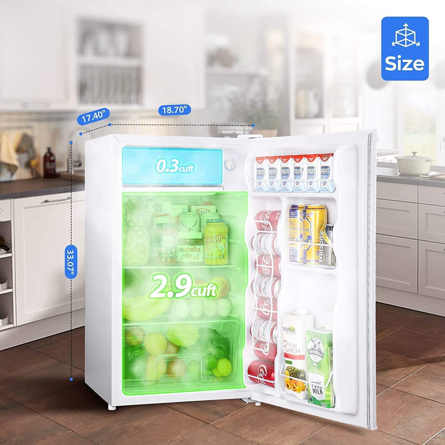 • Compact Single-Door: This mini fridge measures 18.7’’*17.4’’*33.1’’(W*D*H) and has 3.2 Cu.ft(90.6 L) capacity including freezer. The single door design is convenient and space efficient. While being able to grab ice cubes and drinks at one step, this single-door mini fridge has more capacity compares to those double-door small refrigerator with the same size. The storage is greatly utilized, occupies a little space, making it perfect for dorms, offices, bedrooms, RV cars and garages.