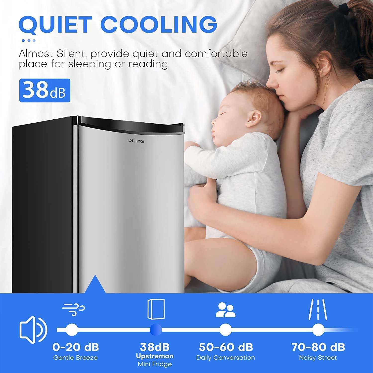• Energy-efficient & Quiet: The mini fridge energy cost is estimated to be as low as 0.5 kWh per day. The small refrigerator working noise is 38 dB, roughly at the level of quiet rural area. Economic and quiet, you will hardly notice its existence when it’s cooling all your food & drinks, ideal appliance for bedroom, study and quiet space.