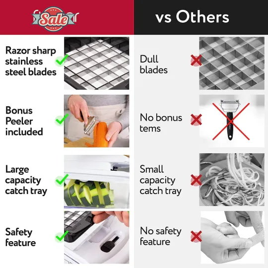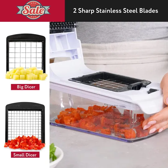 - Quality materials and easy store - our multifunctional chopper dicer comes with a space-saving blade organizer, perfect for saving space in the kitchen. The abs plastic is nontoxic and bpa free guaranteeing healthy meals for your family.