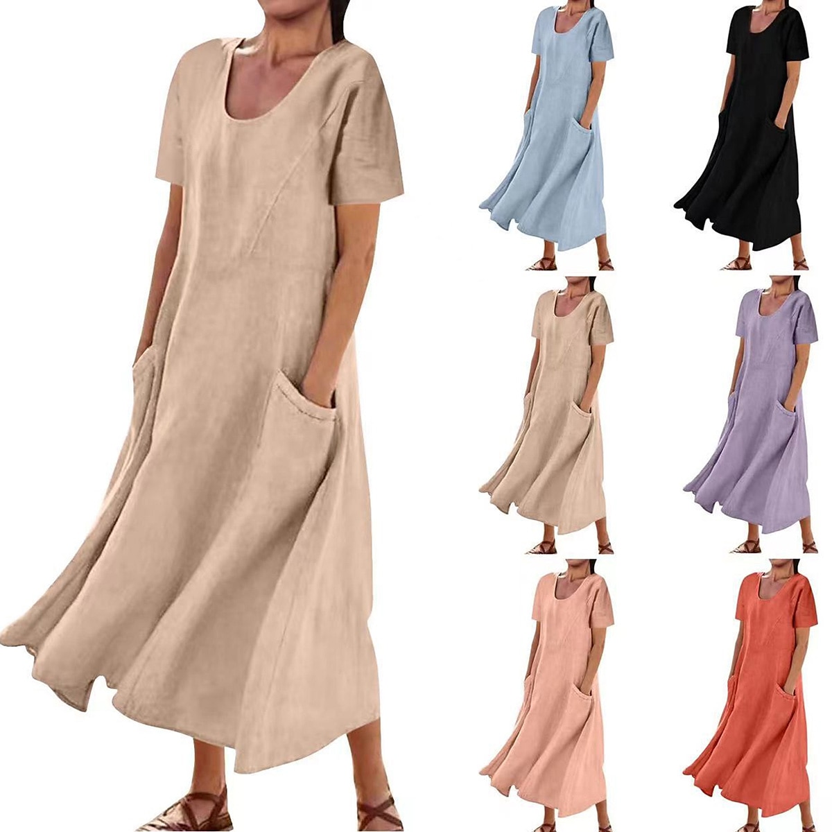 • Women's Cotton Linen Dress Casual Dress Swing Dress Maxi long Dress Linen Cotton Blend Fashion Classic Outdoor Daily Vacation Crew Neck Pocket Short Sleeve Summer Spring 2023 Loose Fit Black Pink Sky