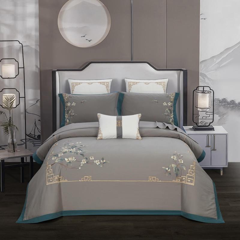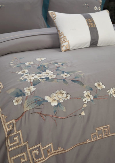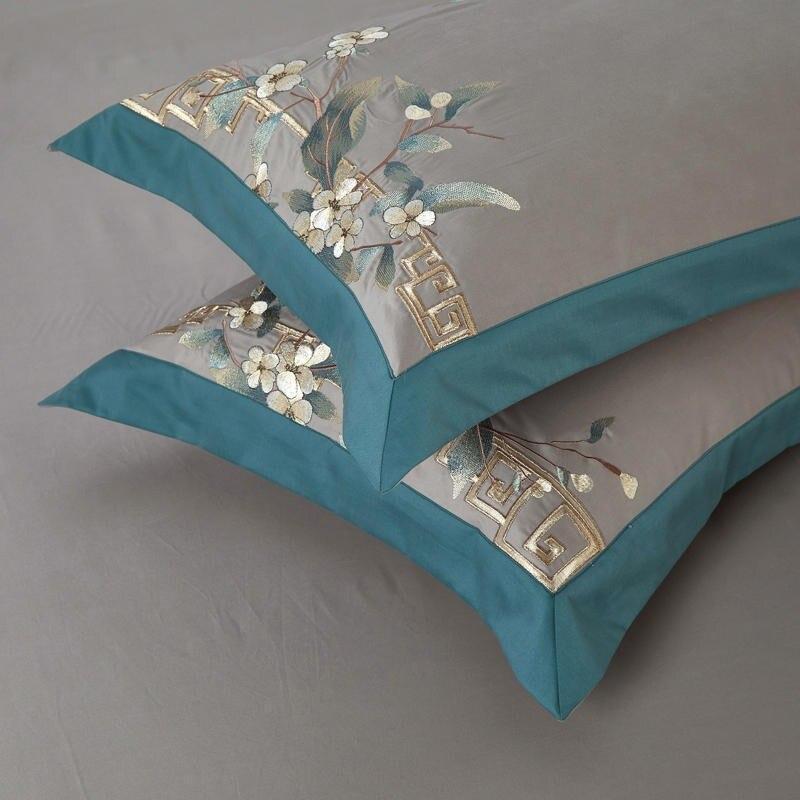 Zoe Chinoiserie Embroidered Egyptian Cotton Duvet Cover Set mixes contemporary trends with the elegance of classic Chinoiserie embroidery to create a blended set that will stand the test of time. Featuring delicate embellishment detailing around the center of the cover which is further enhanced by linear motif embroidery. Added to support the design, with the cleanness of modern style.