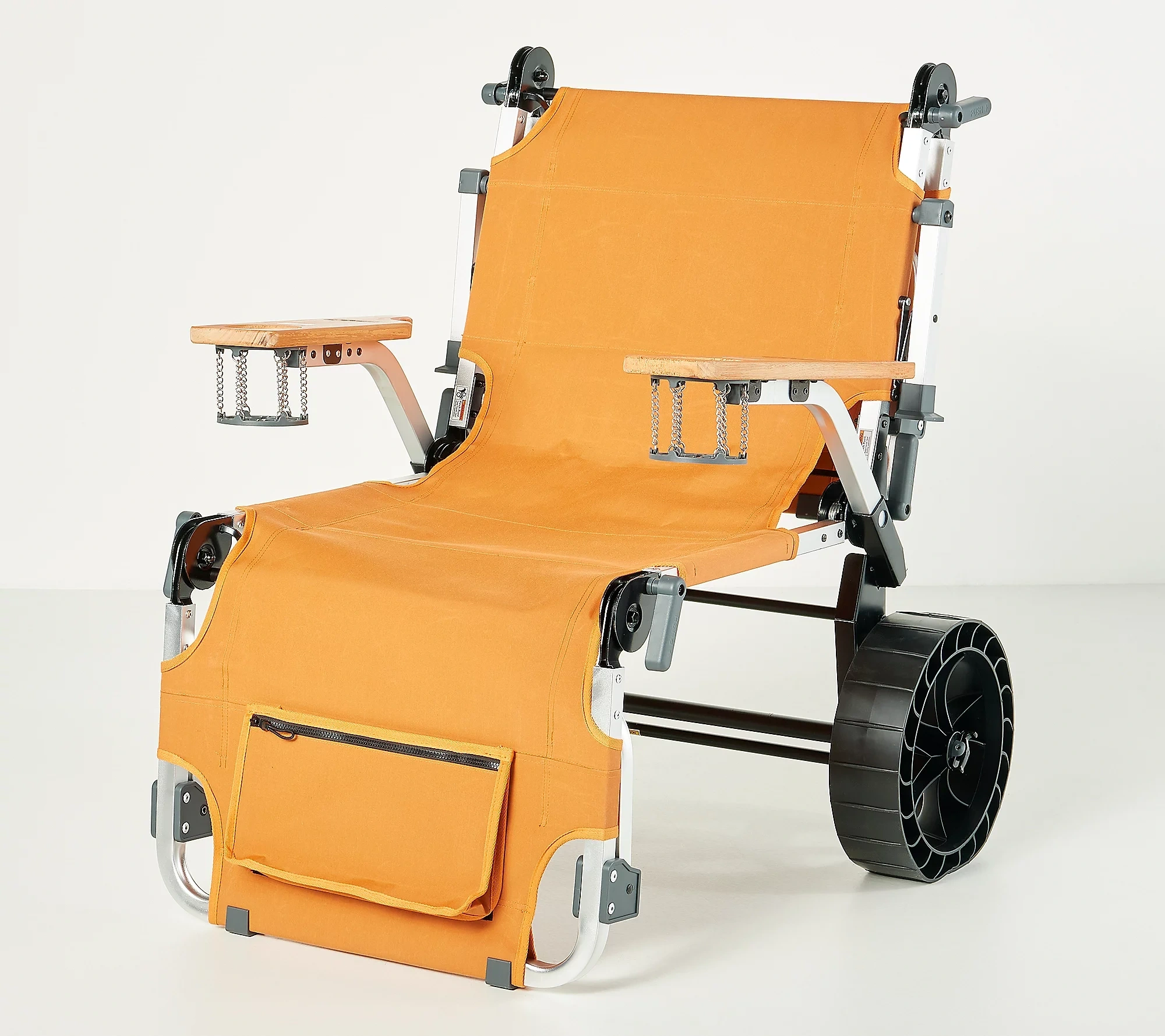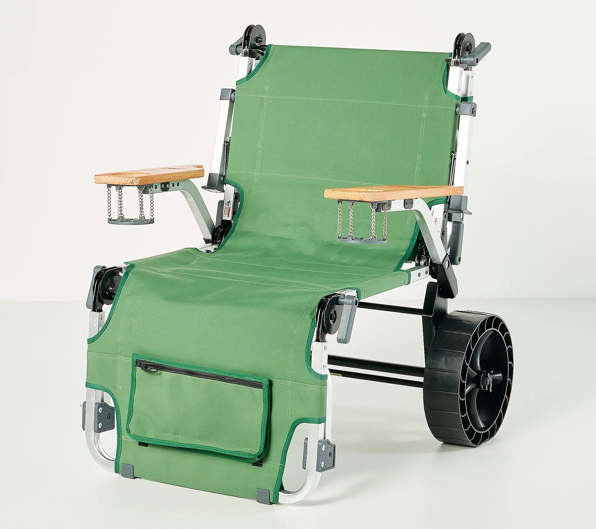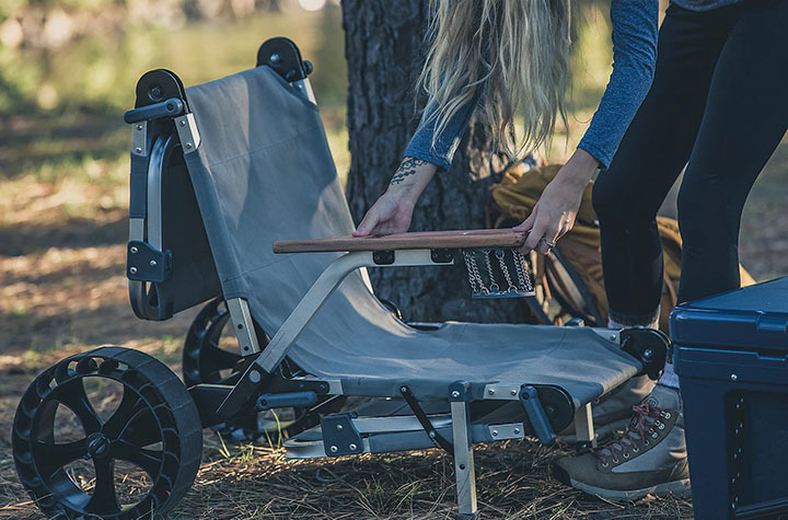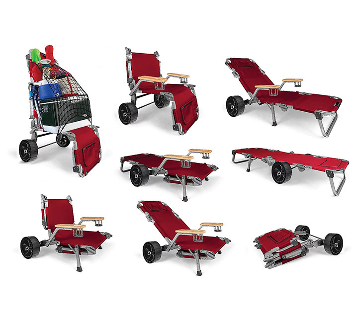 • Outdoor chair and gear hauler with five modes: cart, low-slung beach chair, upright camp chair, reclining lounger, and camping cot/bench
