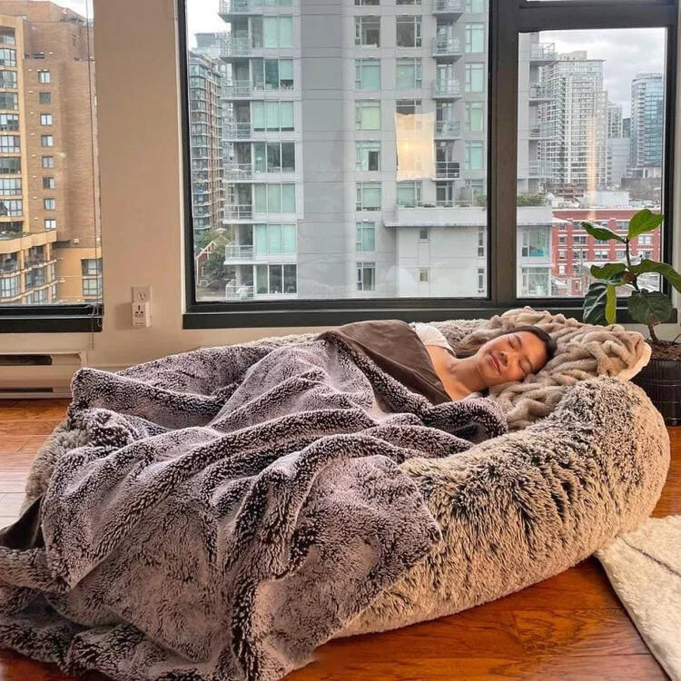 Its features include a thick pillow border for users to tuck their hands and feet into, an orthopedic memory foam that provides ample support, and a soft, luxurious faux fur that is calming to the touch. Its oval shape cradles you into a natural fetal sleeping position that will have you sleeping like a baby in no time.