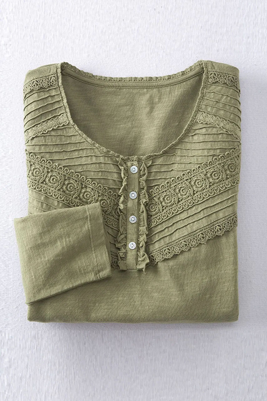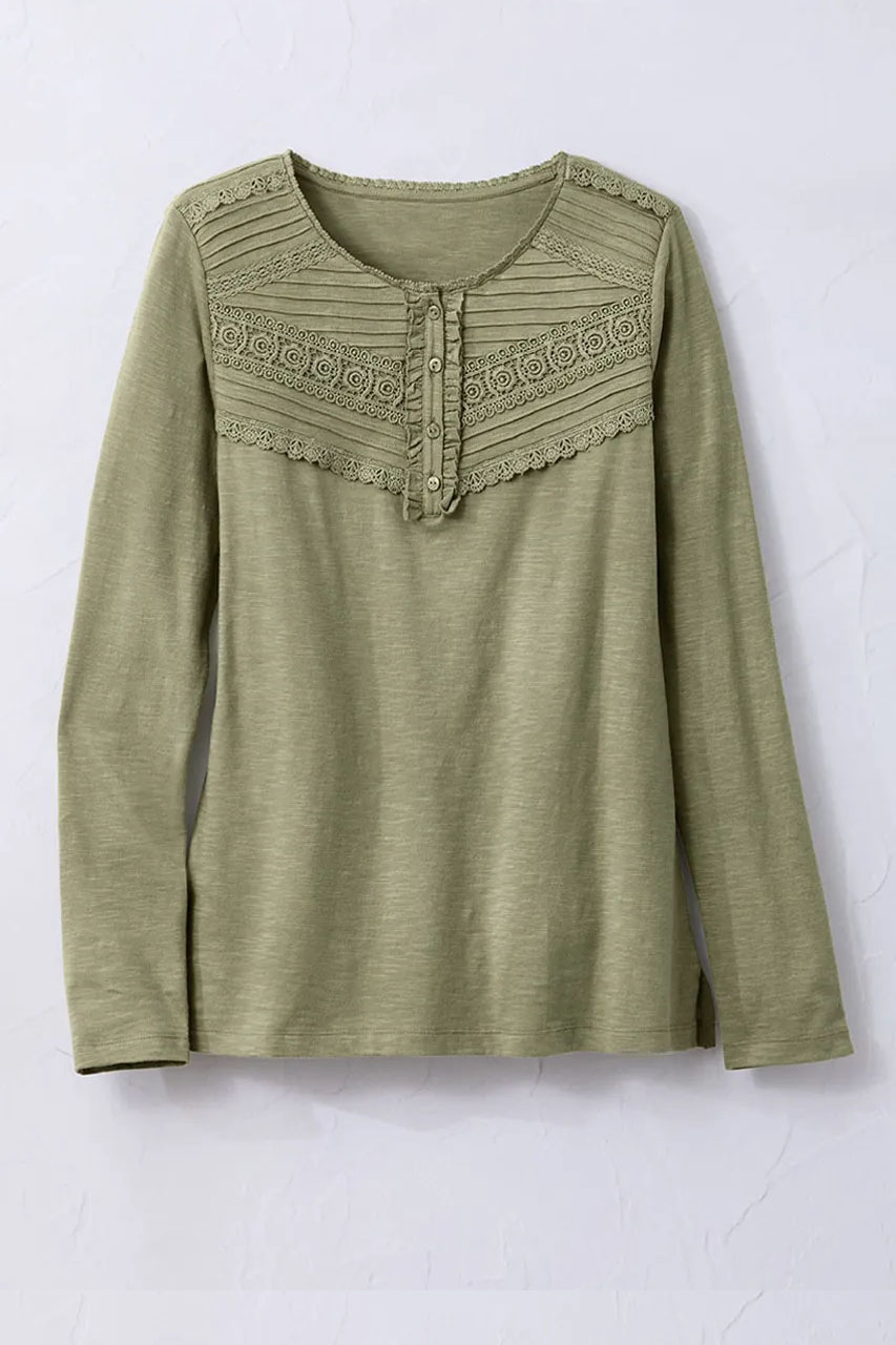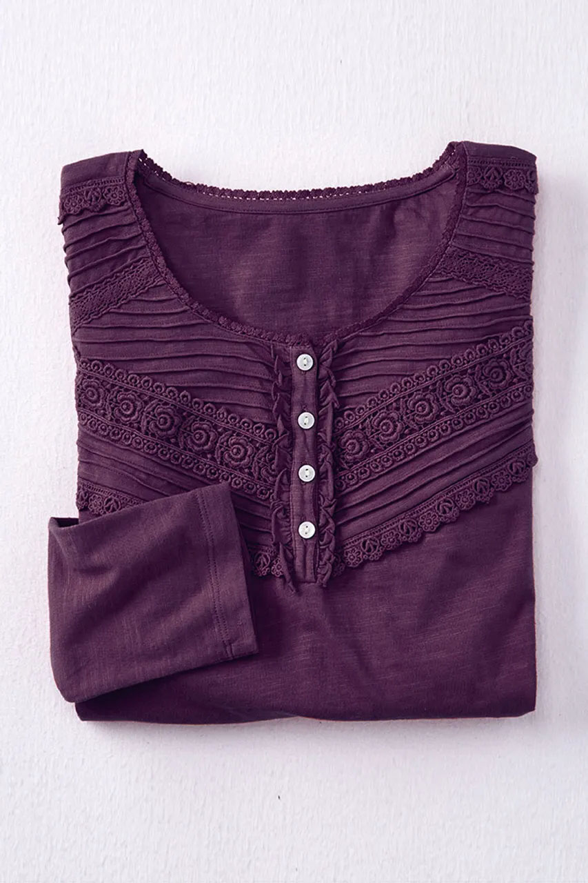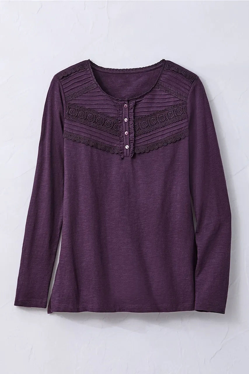 A charmed tee with subtle texture and special details. Lightweight Henley style is garment-dyed in a soft slub knit, with a front yoke of tucks and lace. Long sleeves, side slits.