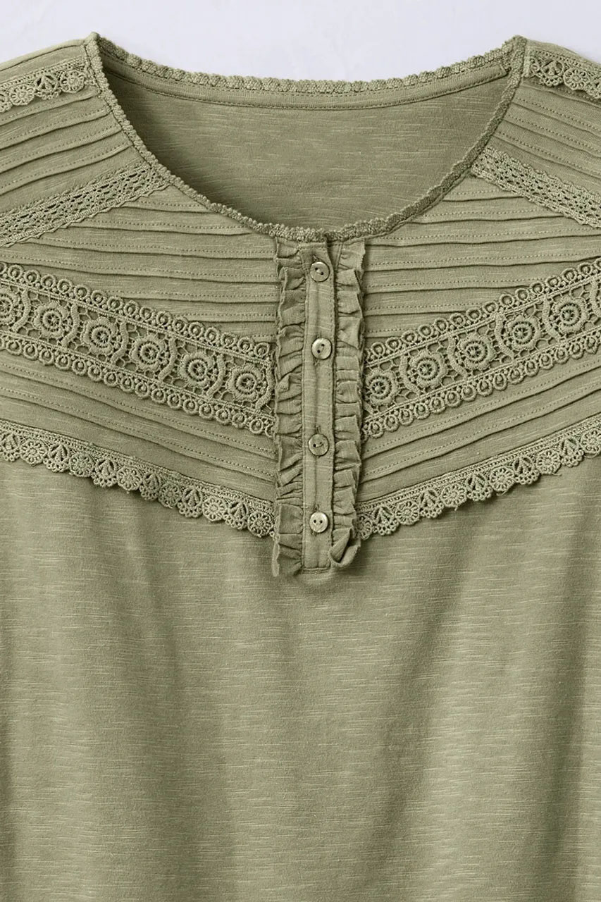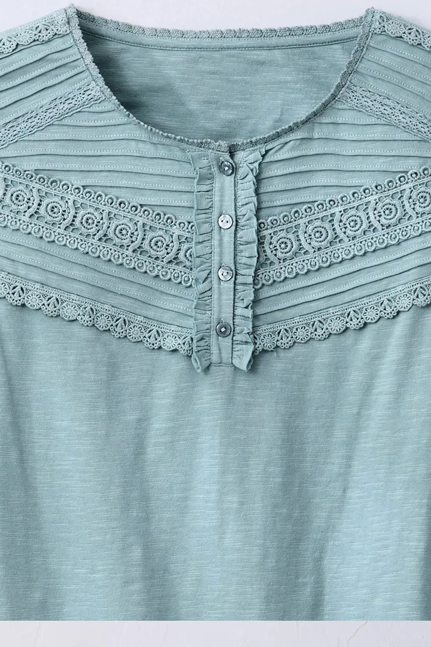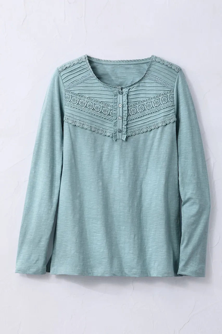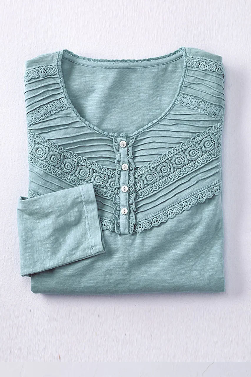 A charmed tee with subtle texture and special details. Lightweight Henley style is garment-dyed in a soft slub knit, with a front yoke of tucks and lace. Long sleeves, side slits.
