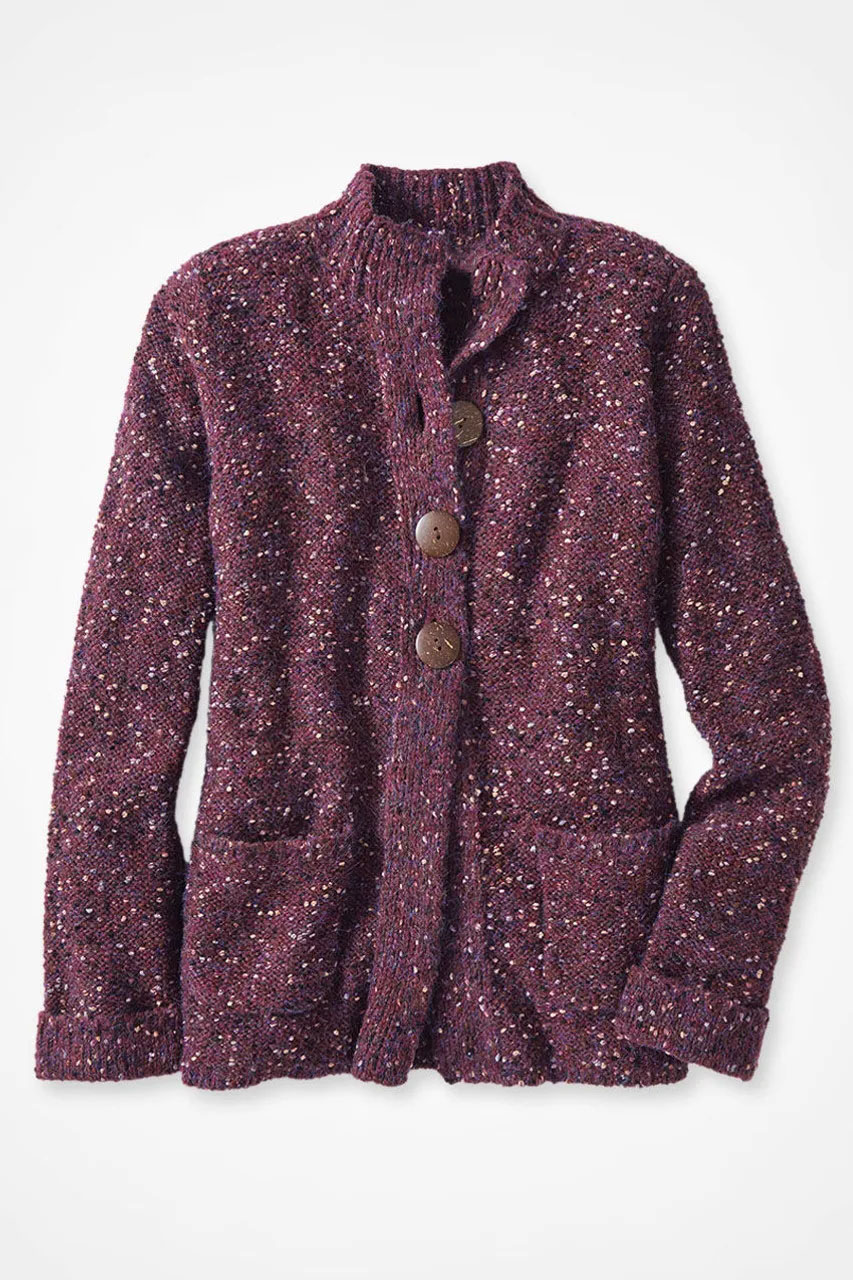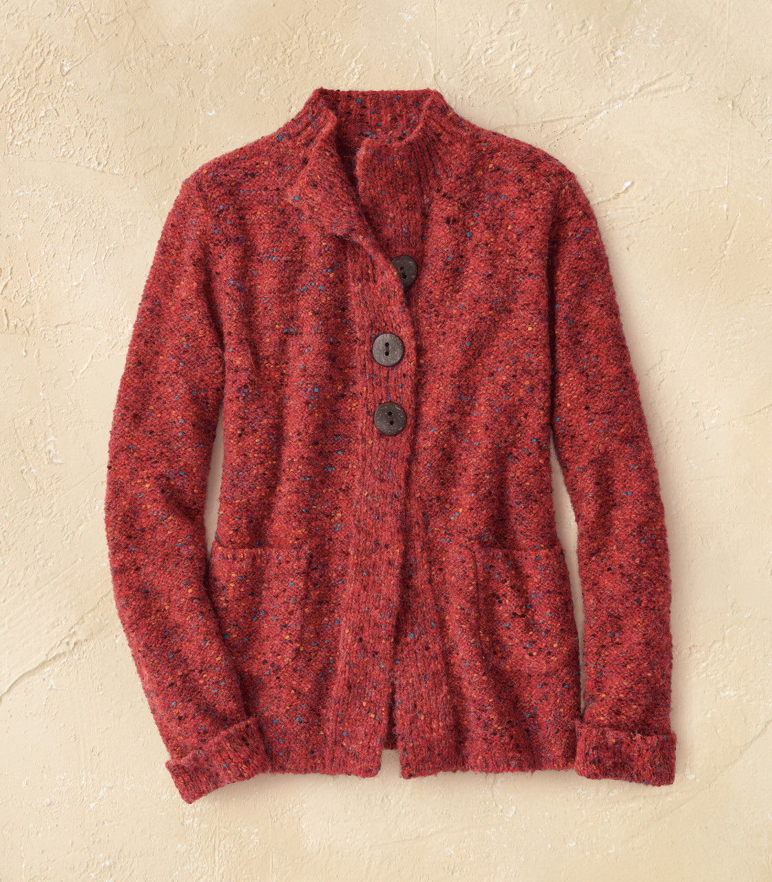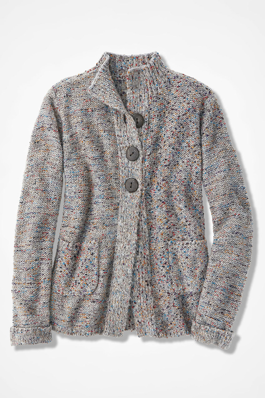 As colorful as confetti. This midweight, 3-button cardigan offers soft texture, in bouclé yarns flecked with multiple hues. Ribbed stand collar, patch pockets and cuffed long sleeves.