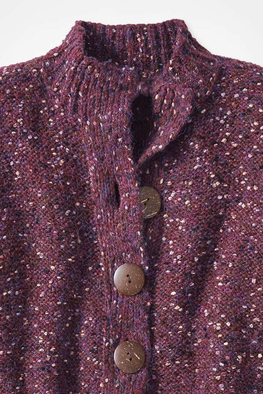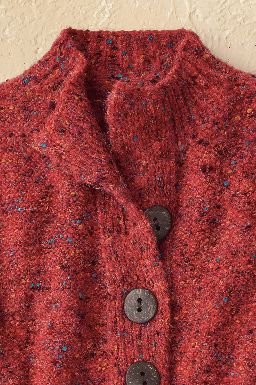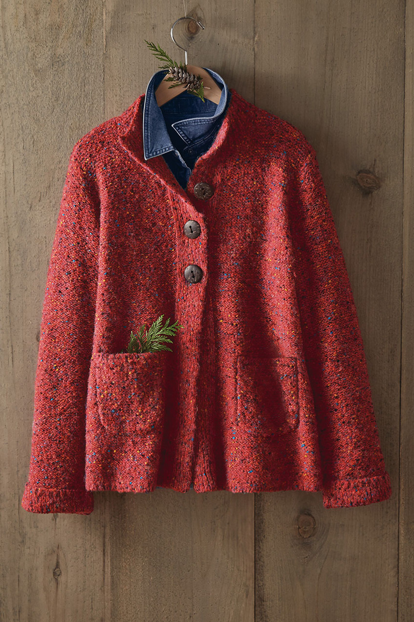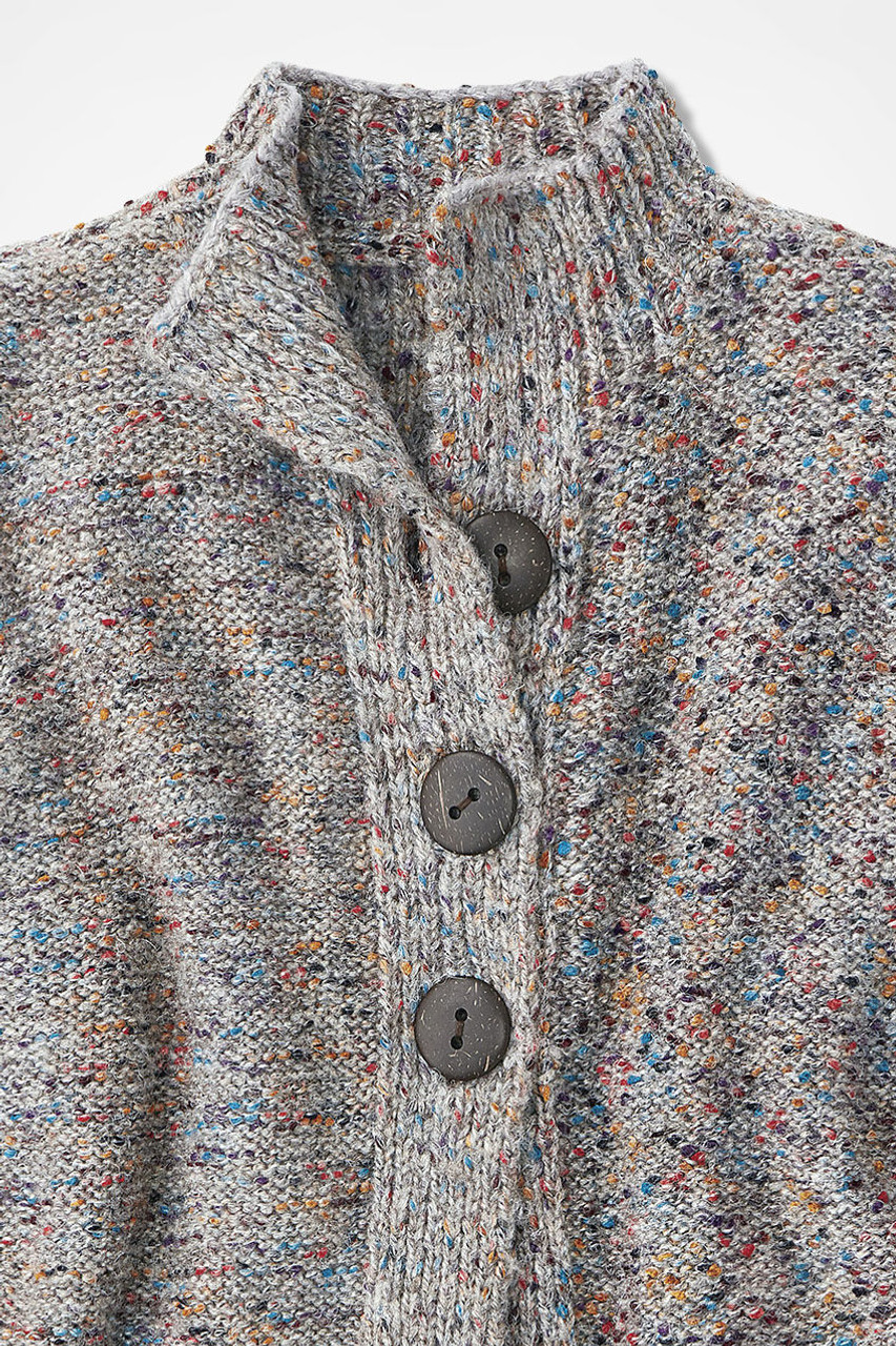 As colorful as confetti. This midweight, 3-button cardigan offers soft texture, in bouclé yarns flecked with multiple hues. Ribbed stand collar, patch pockets and cuffed long sleeves.