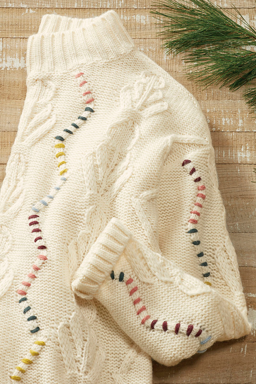 A one-of-a-kind addition to your winter sweater collection. Colorful handsewn accents trace their way between raised knitwork motifs with unique, vintage-inspired artistry.