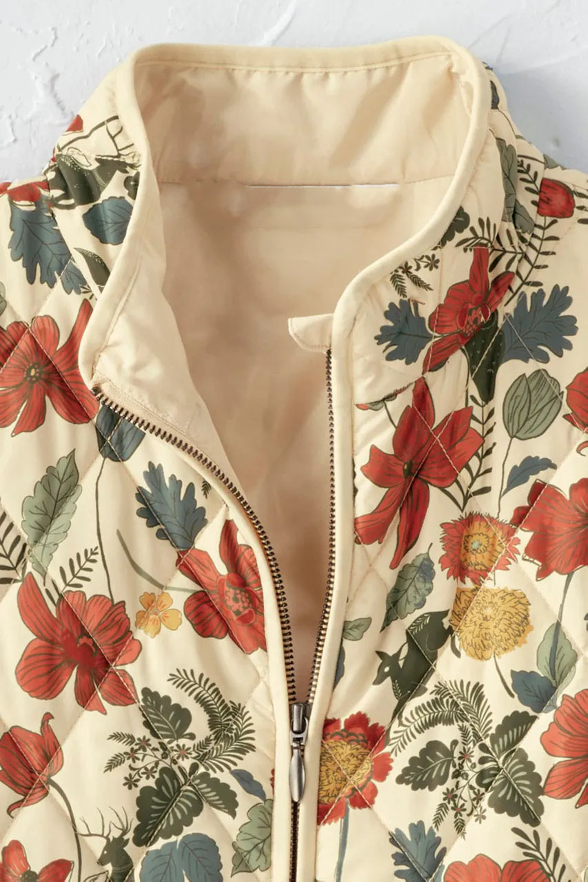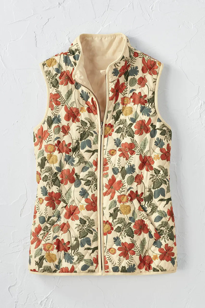 Flora and ferns in autumnal hues, on our newly updated quilted vest – now in a more flattering fit, with enhanced elastic at the back waist for shaping, and a great everyday length. Lightweight style is ideal for in-between days or for adding a pop of color. Zip front, with a fabric zipper guard at the neck to protect your chin. Side pockets plus two inside pockets.