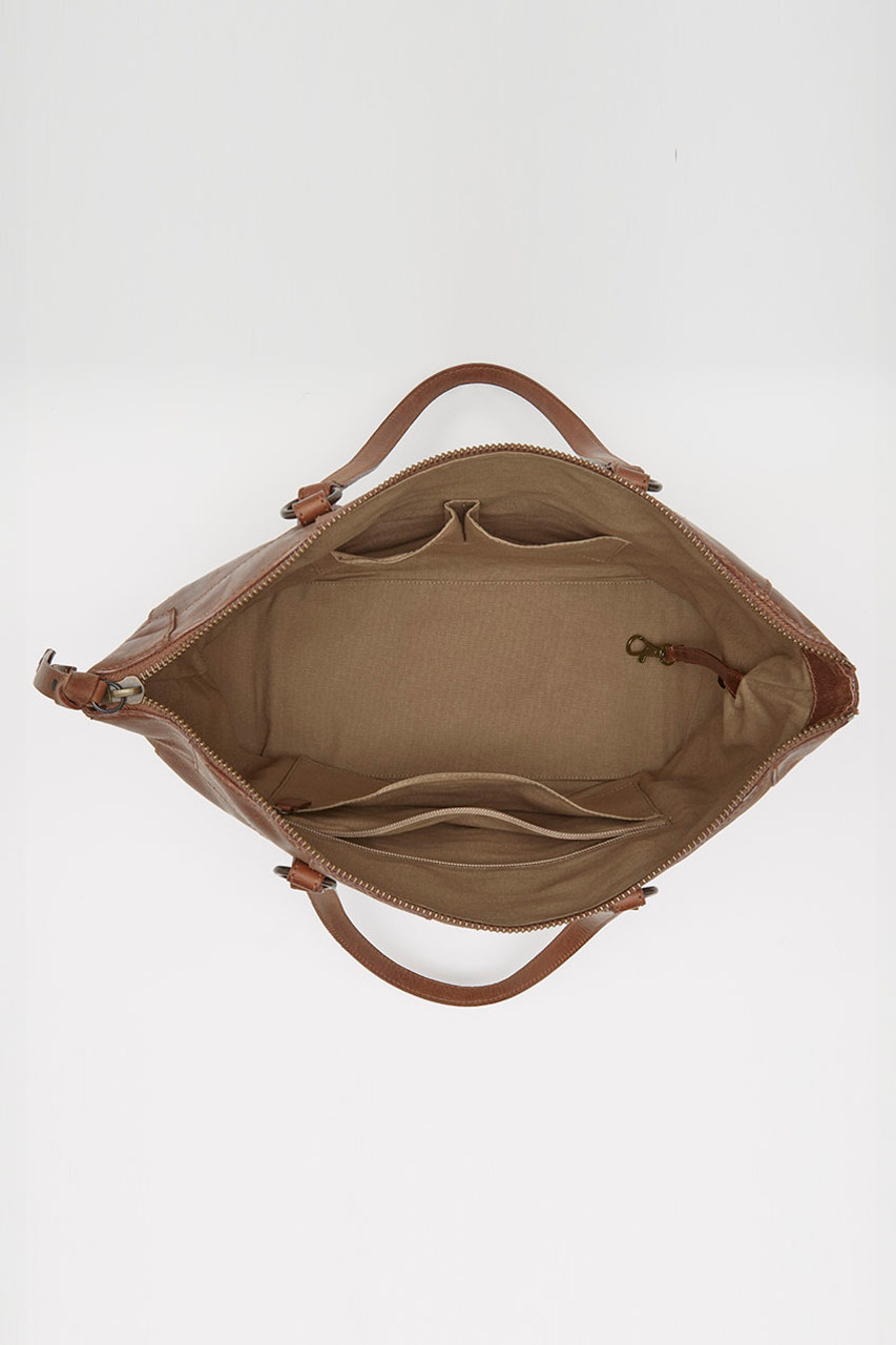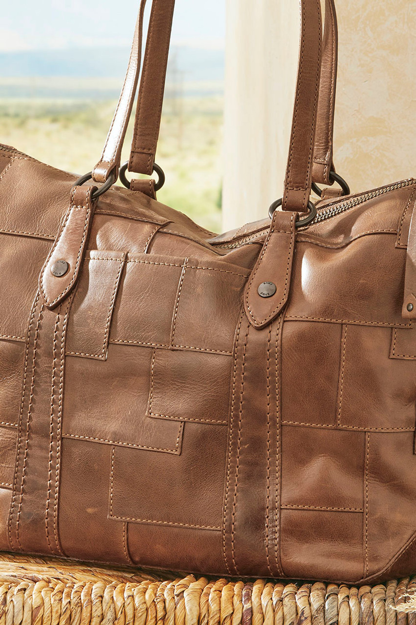Authentic, artisan details with Frye's signature quality. This roomy, genuine leather bag is stitched with an organically placed patchwork design for standout style. Zip closure with inner zip pocket and two slip pockets.