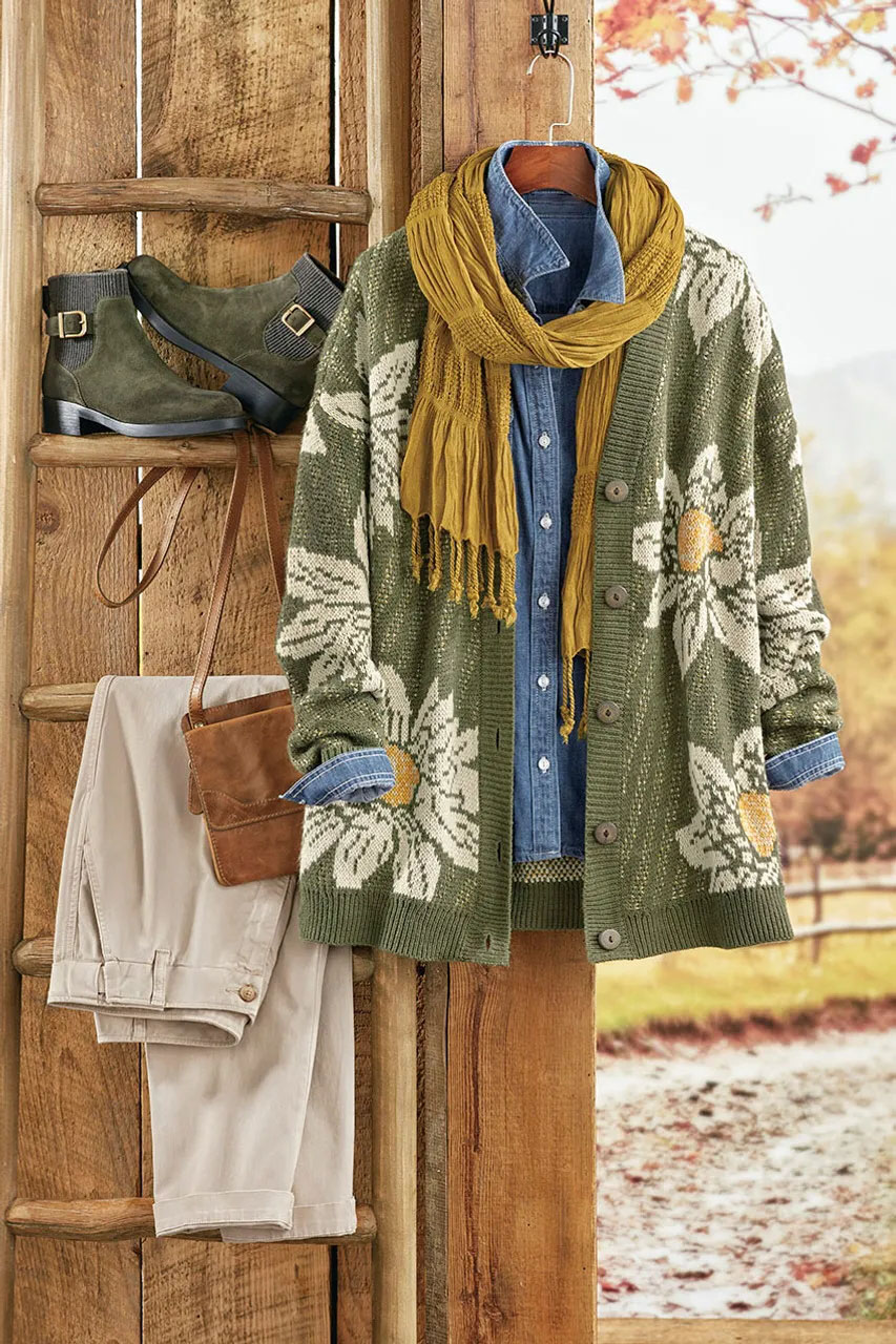 The fine art of flower arranging, in a statement cardigan you’ll love to layer. Bold sunflowers on the front and sleeves are balanced with allover bird’s-eye jacquard stitchwork. Soft and lofty with V-neck and dropped shoulder seams for a roomy feel.