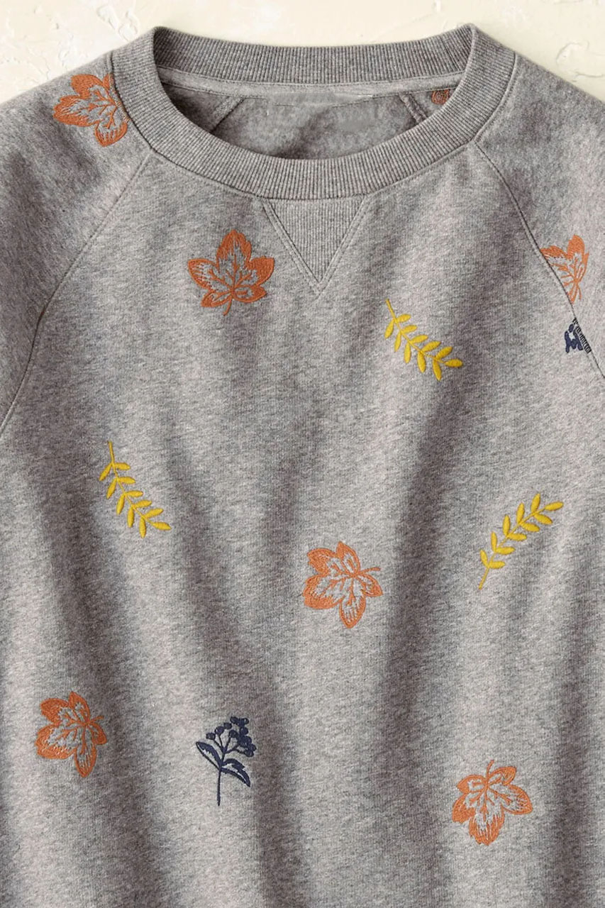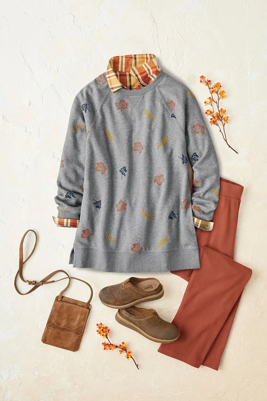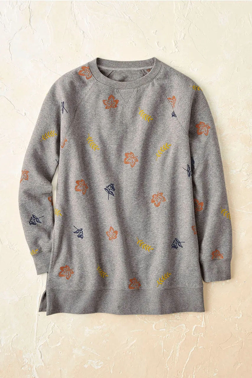 The soft-washed fleece you love, ready for the season in a longer-length tunic style embroidered with drifting leaves. Triangle-stitch neck detail plus on-seam pockets, side-slit banded hem and raglan sleeves.