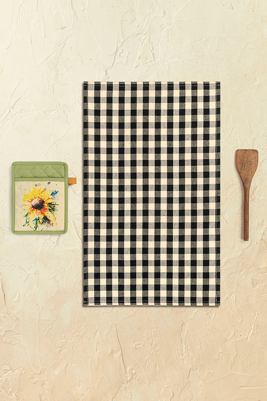 Make your kitchen a little brighter with this handy set, highlighted with a nuanced sunflower print by Oregon artist Dean Crouser. Black and white cotton towel, 30" x 18", machine wash; cotton hot pad with polyester fill, 9" x 7", machine wash; acacia wood spatula, 12" long. Hand wash.