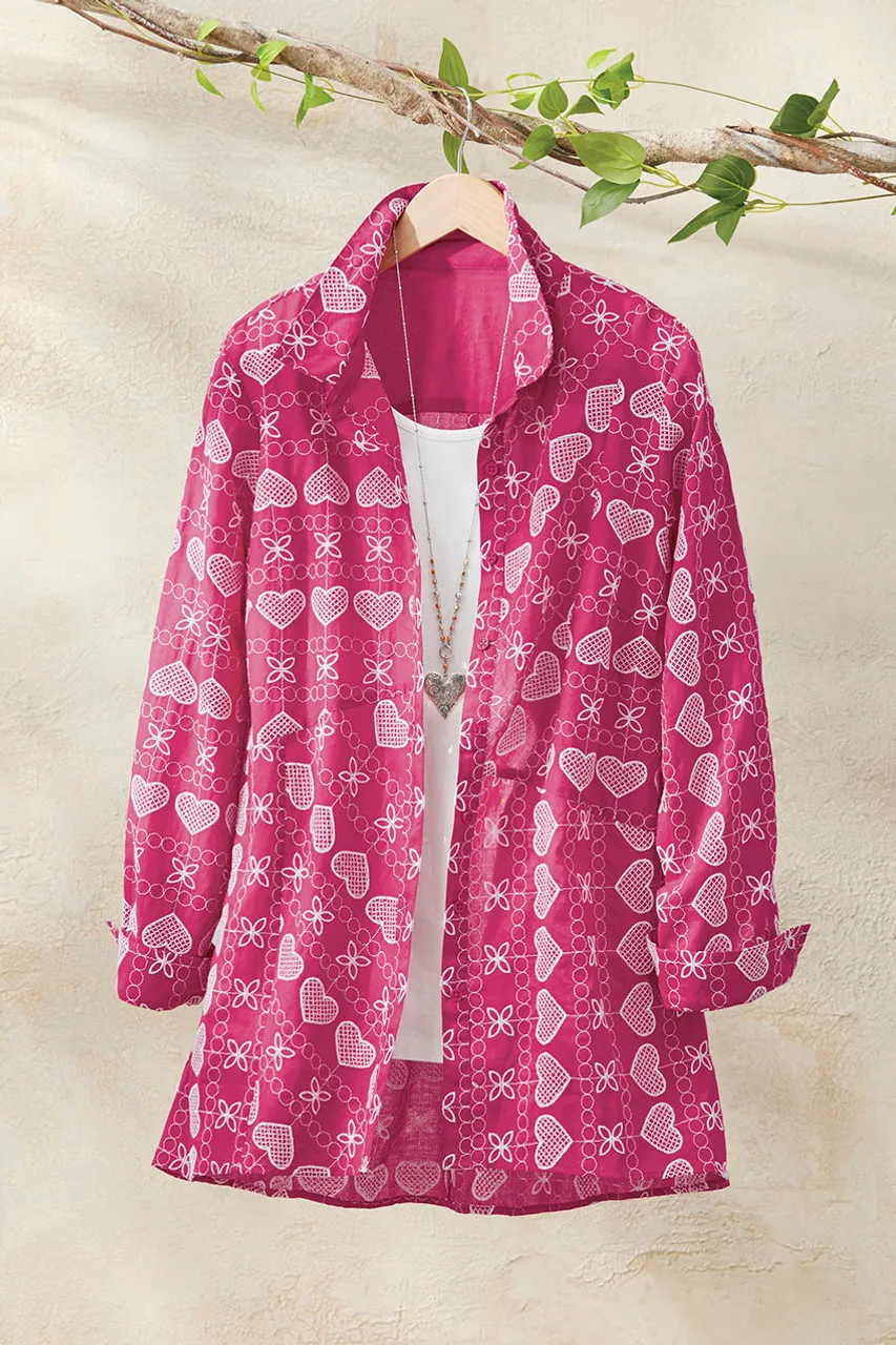 Latticed hearts, pieced at angles in an artful arrangement. Bright and happy in cotton voile, this embroidered shirt is just the thing for spring. Slight high-low hem.