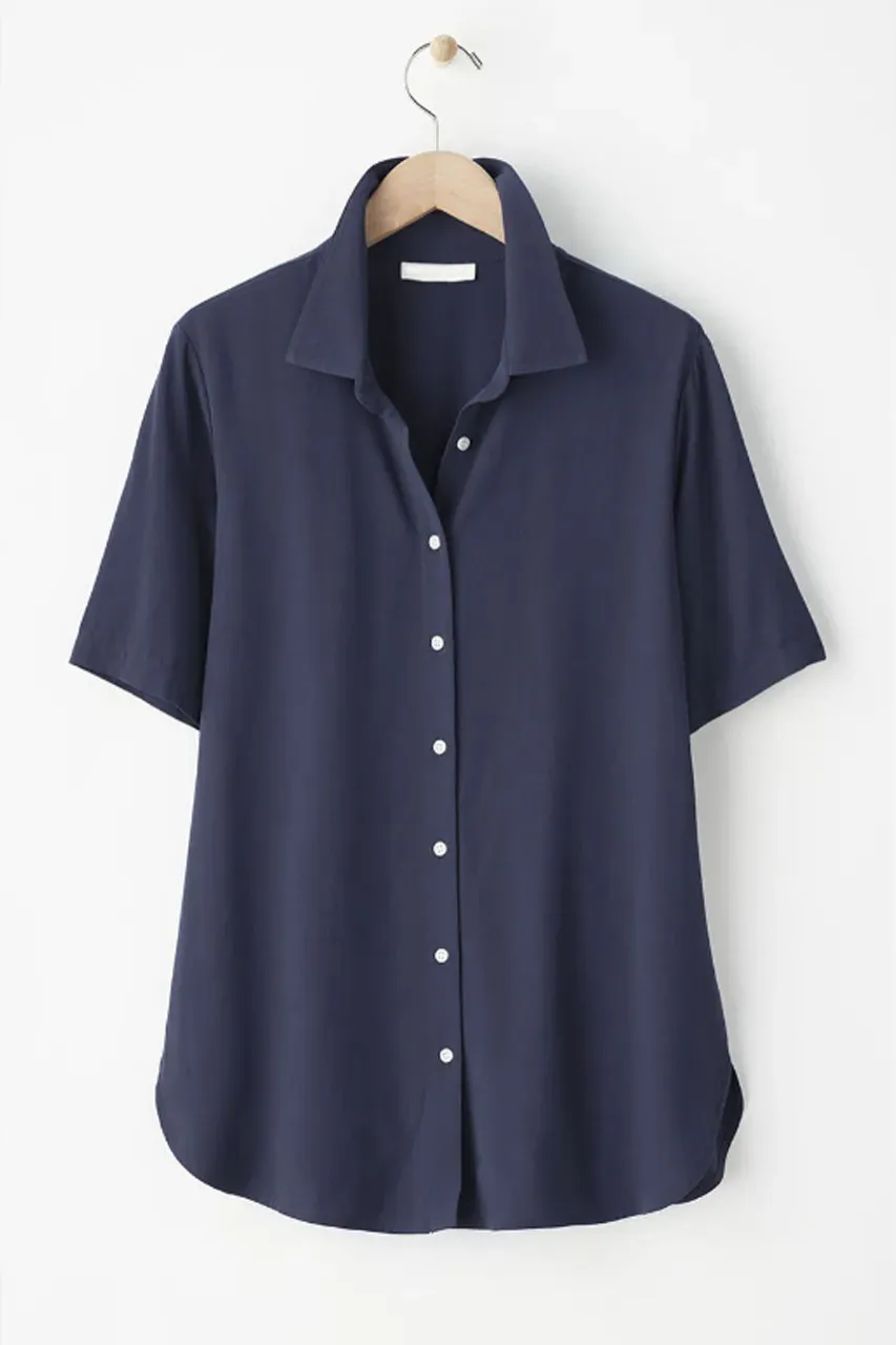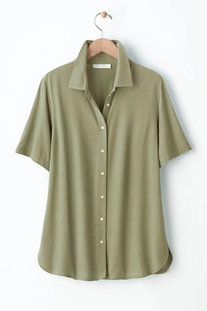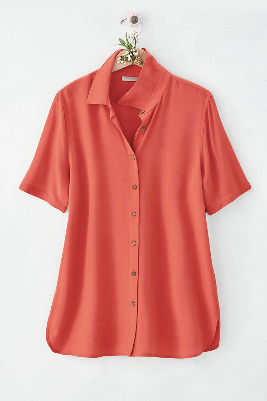 A bestseller for its softness, beautiful drape and casual versatility, our button-front Bistro Shirt is back with a refined feminine fit and longer length. Straight hem with rounded side slits. Imported.