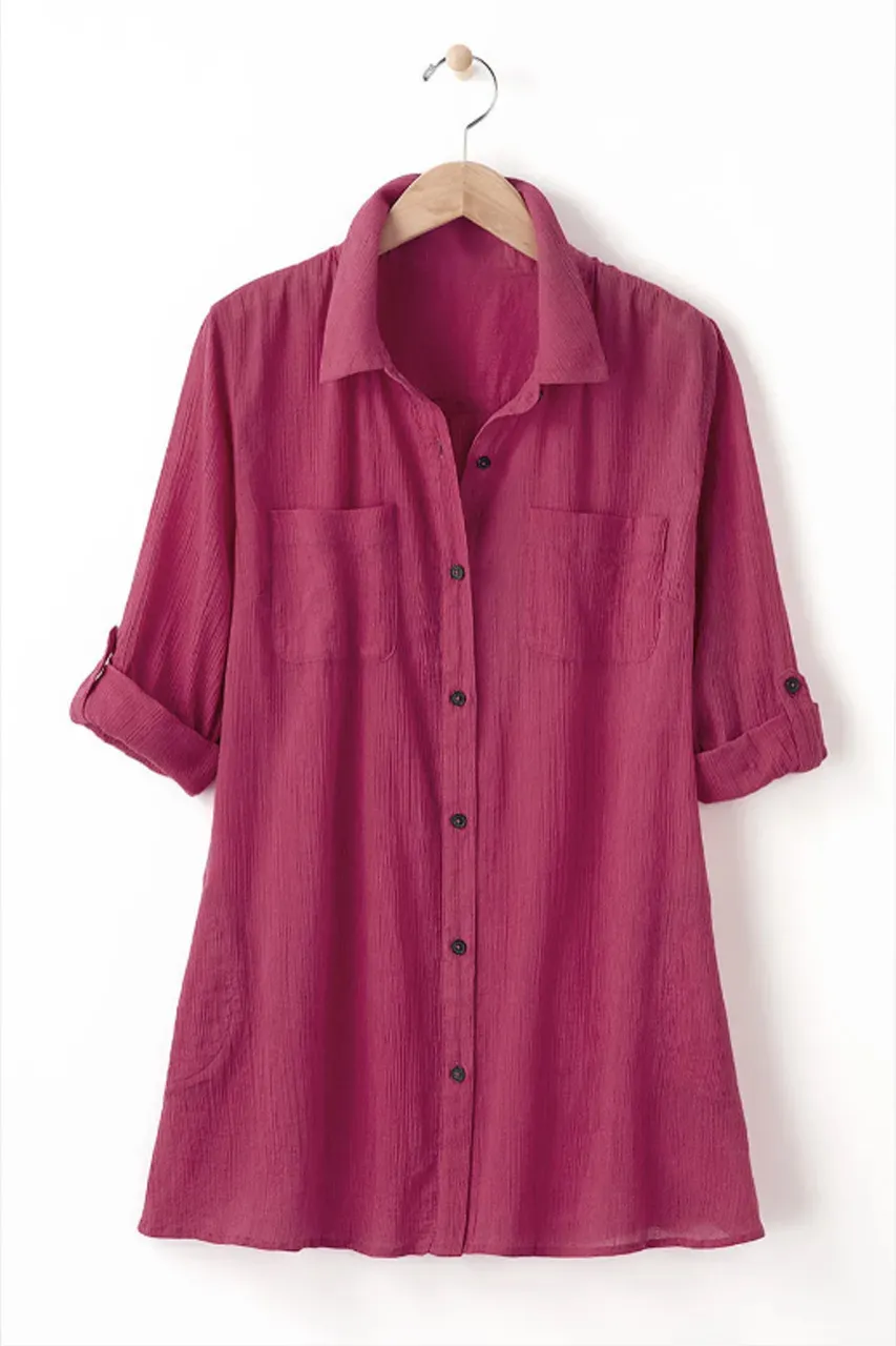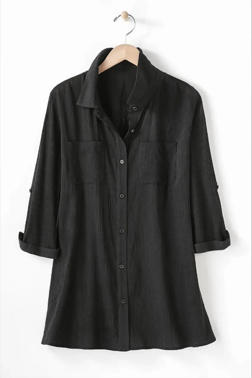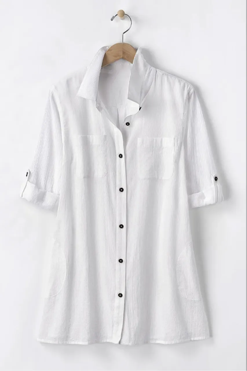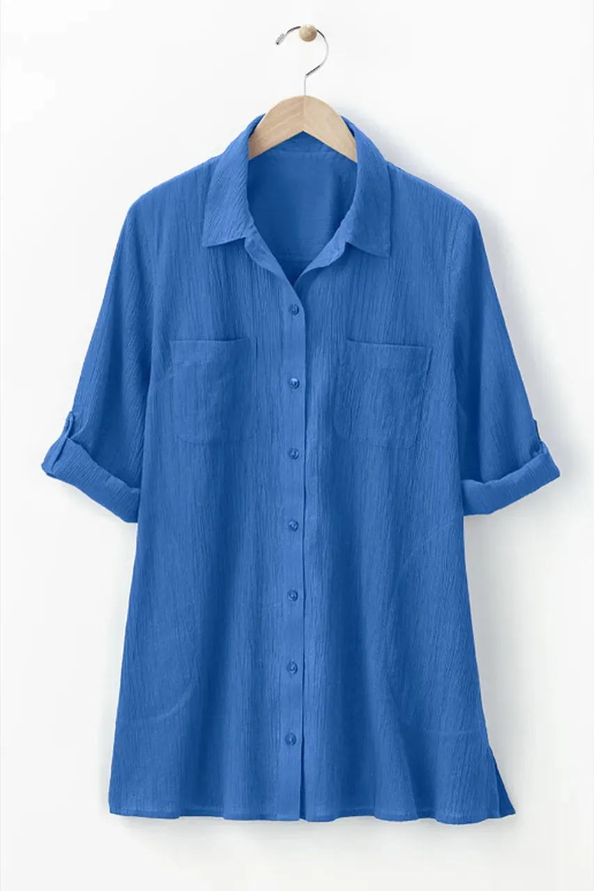 The perfect shirt when you want an easy, breezy layer or swim cover-up. Generously cut with side and chest pockets, side slits and 3/4 roll-tab sleeves.
