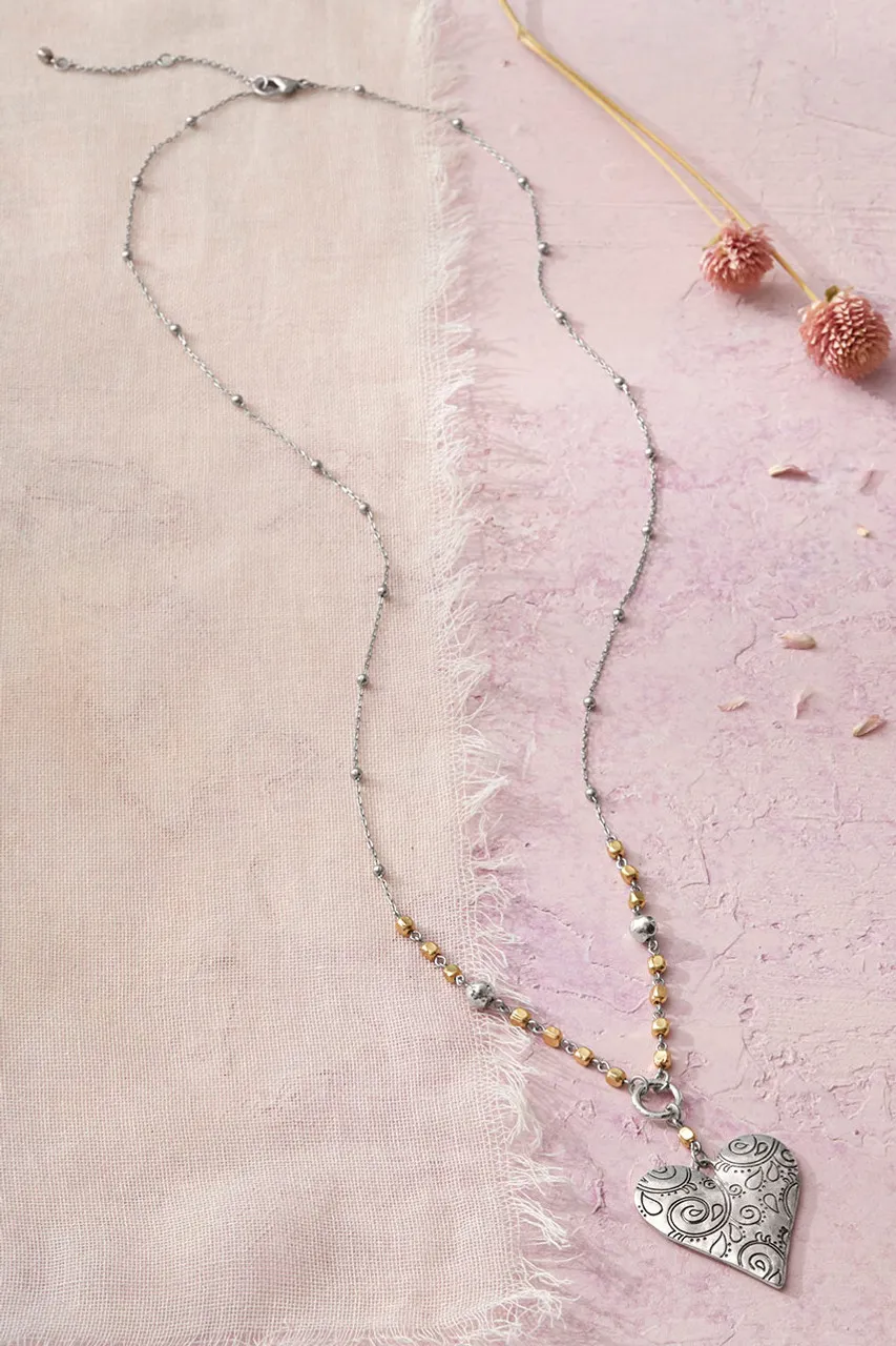 Follow your own heart��s path �C etched in folkloric patterns on this charmed pendant. Silvery heart and chain are accented with gold beads for wonderful versatility.