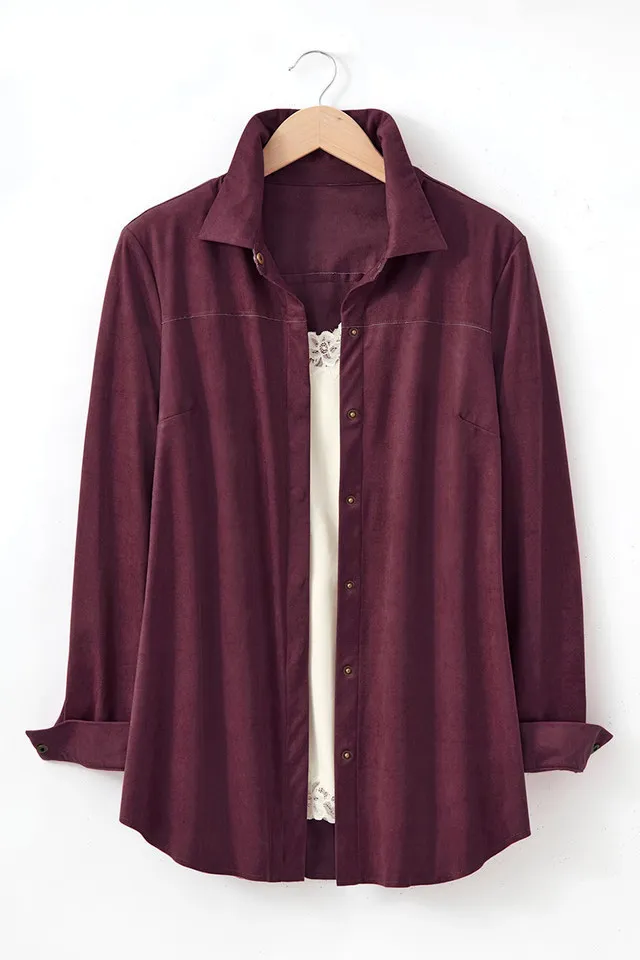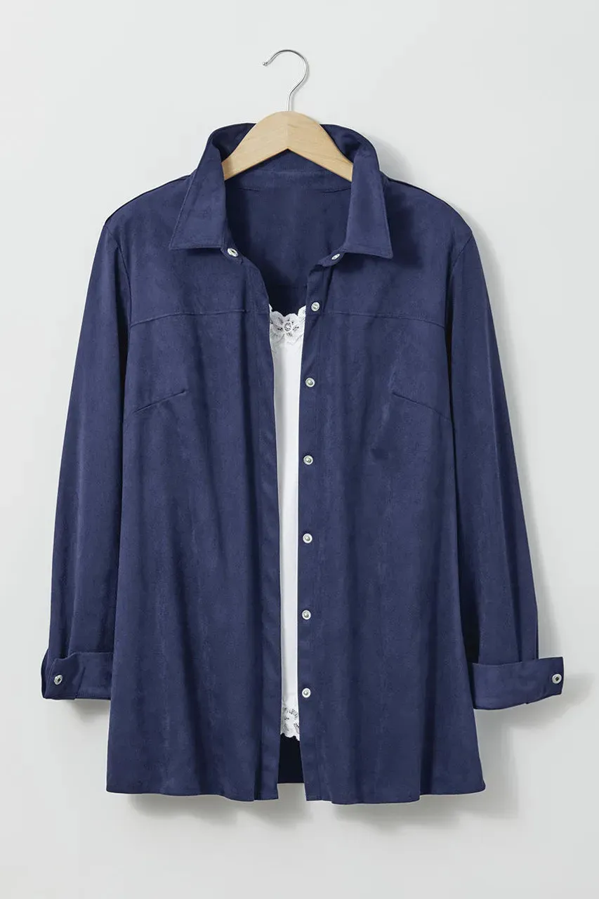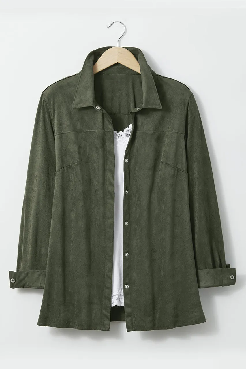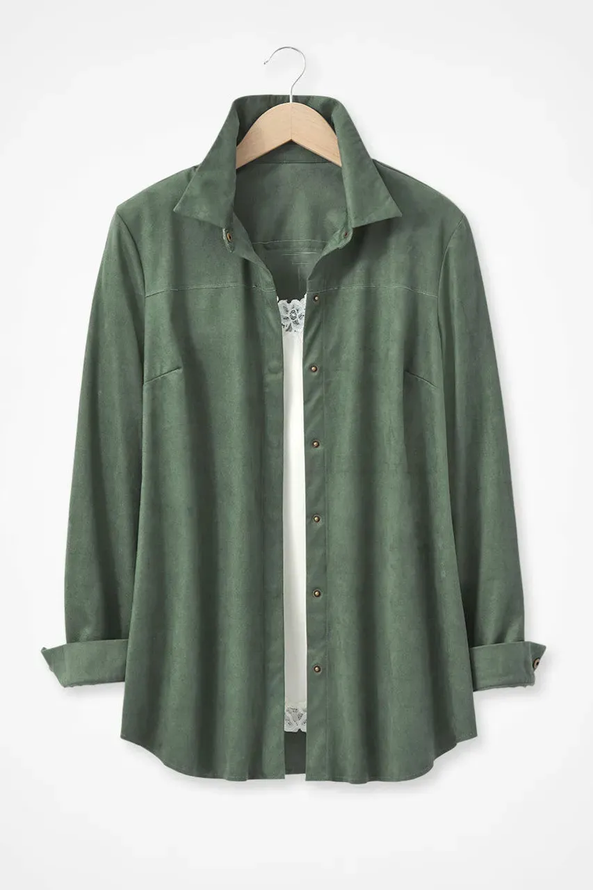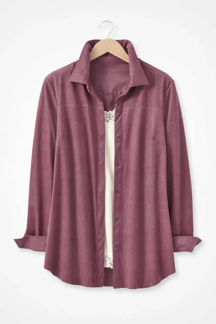 Luxurious to the touch with soft and supple stretch, and so easy to wear in a versatile, roomy silhouette. Detailed with raw-edge seams at the front and back yokes and atop the shoulders. Full hidden snap front.