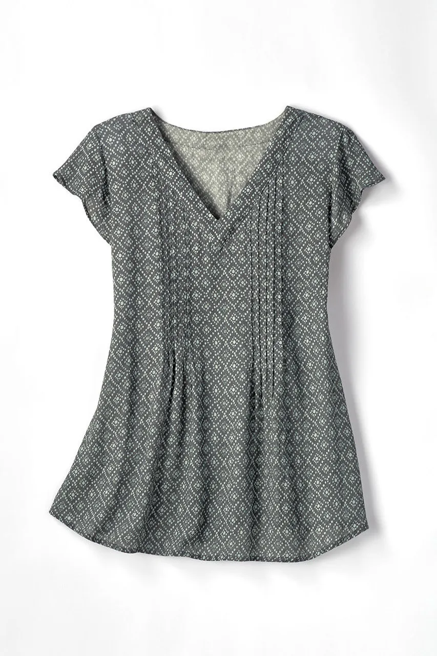 A favorite slipover style, latticed with an artful geometric diamond print. Pintucks release into a flattering drape – beautiful layered or solo.
