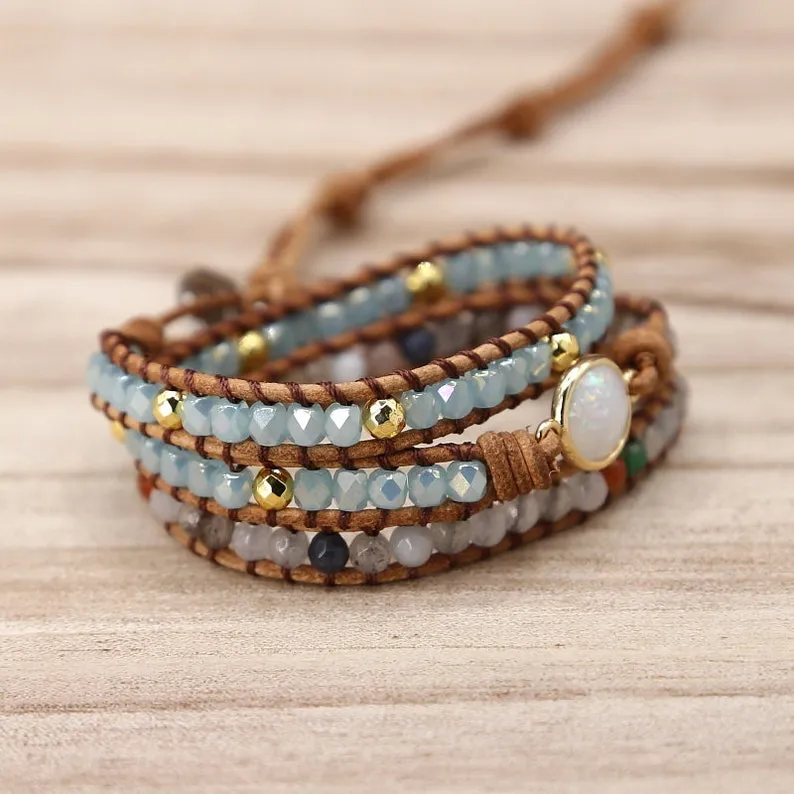 Material: Man-made Opal, Clear Quartz, Rhinestone, Hematite, White Jade, Vegan Leather