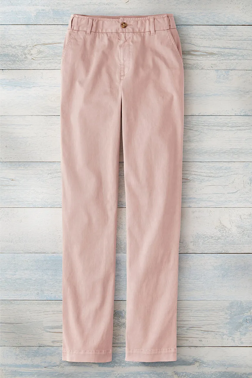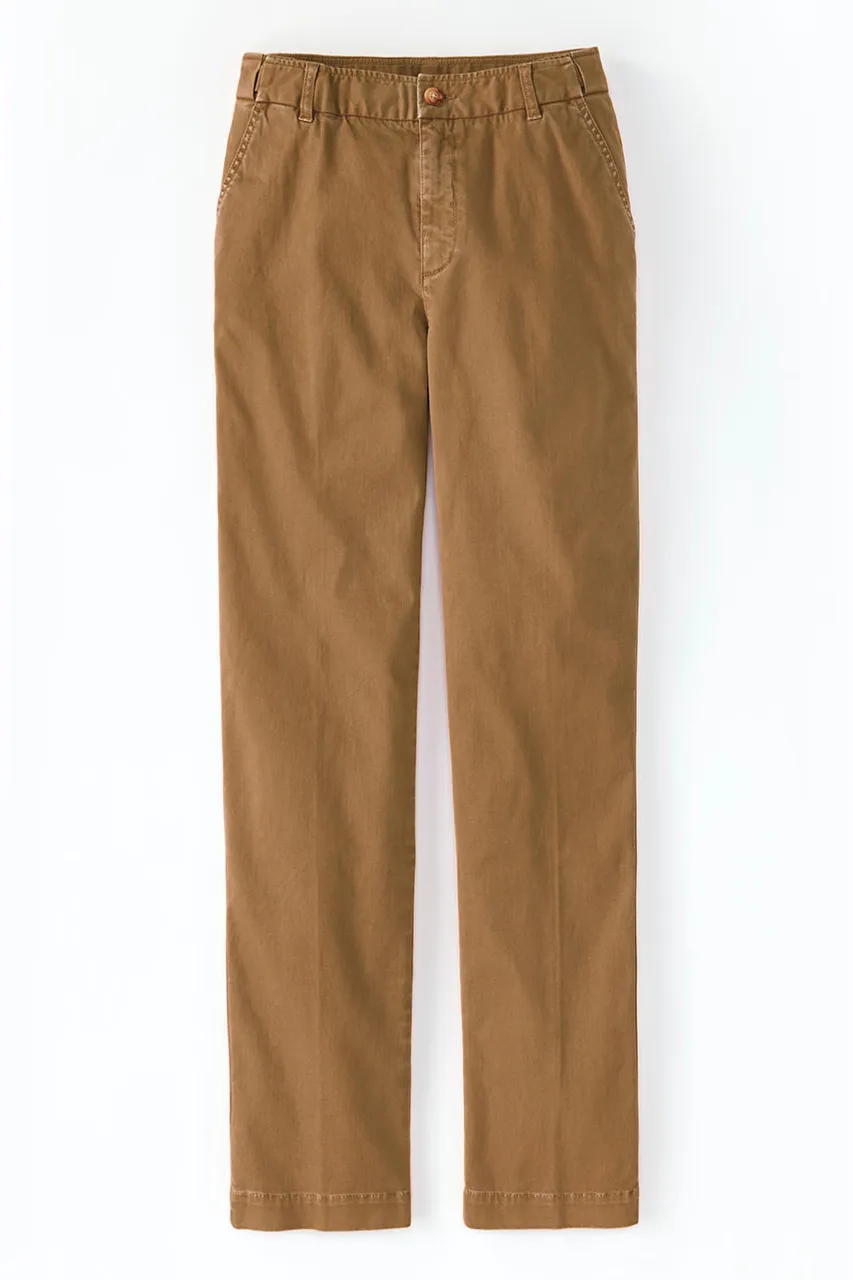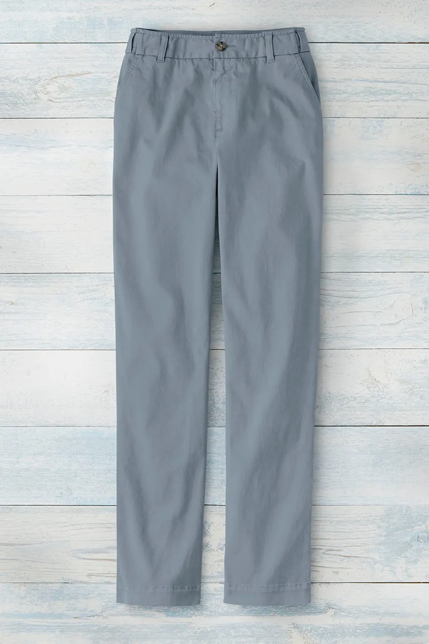 Our everyday chinos, with hidden side elastic bands that expand up to 4" at the waist. Fly front with double-button closure.