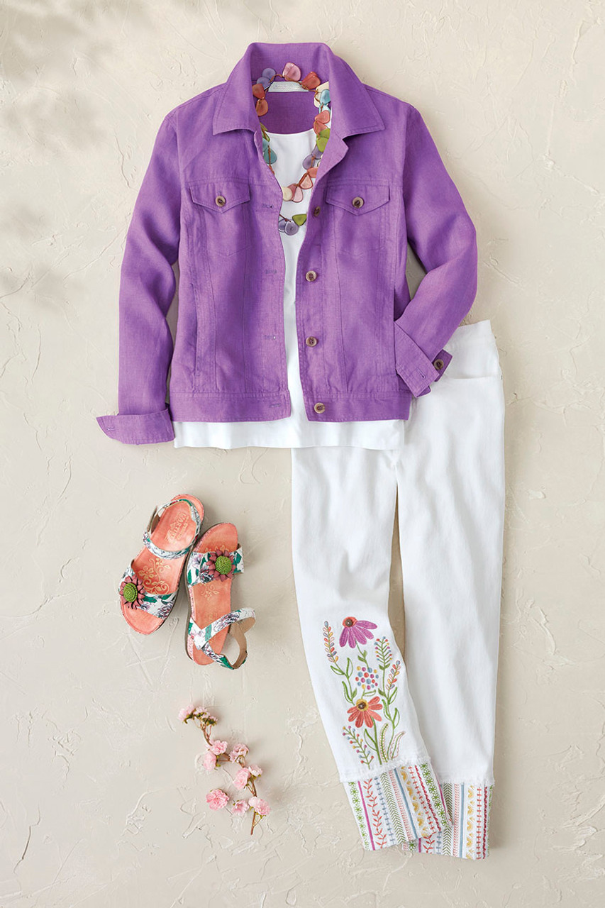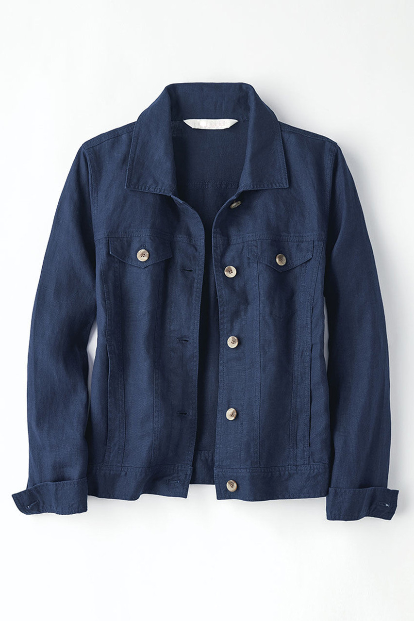 Classic jean jacket styling, updated in lightweight, washable linen. Faux-horn buttons at the front placket, chest pockets and cuffs.