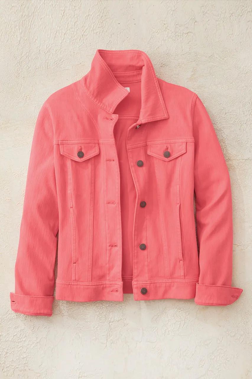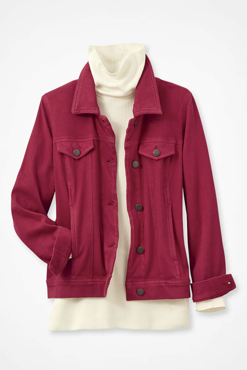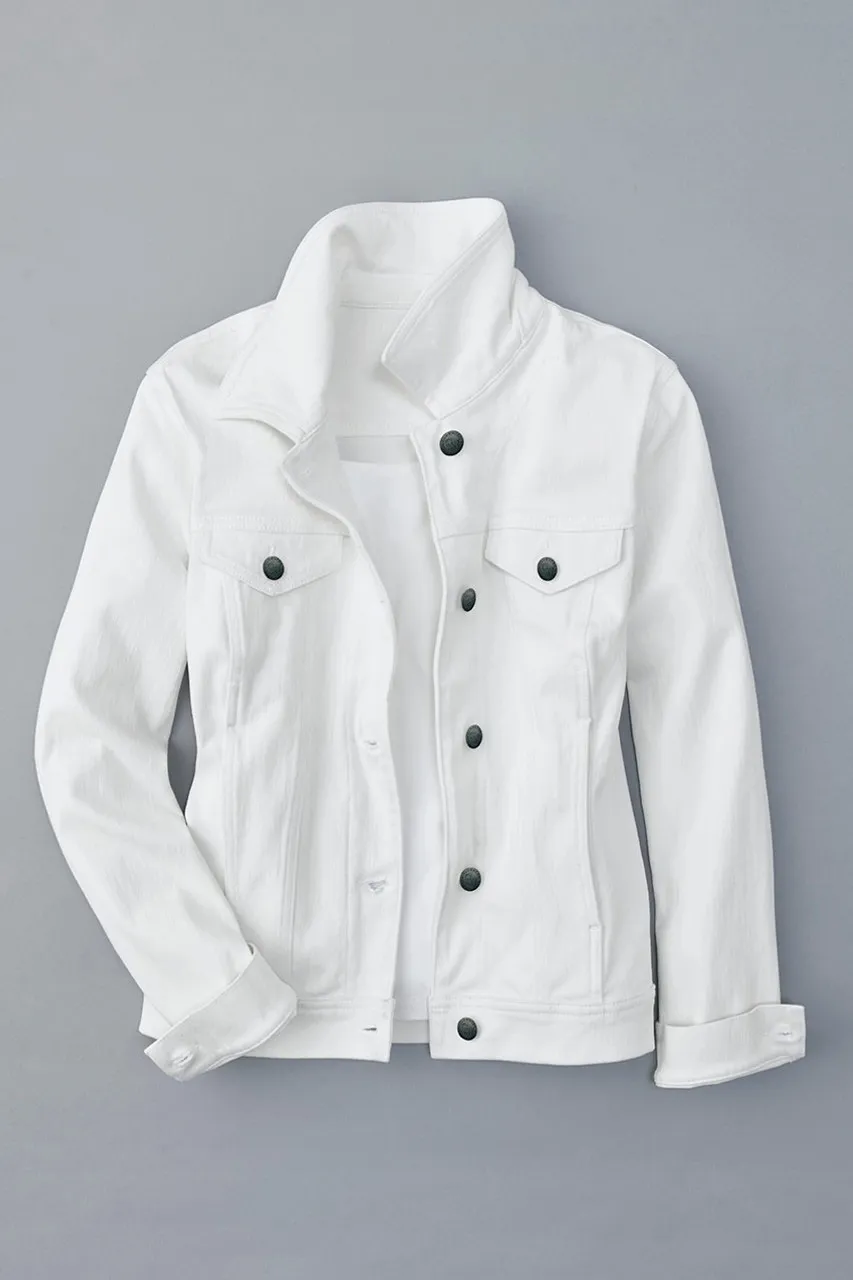 Comfortable, stretchy knit denim for all-day ease. Seamed front and back panels and front and back yokes, plus flap and on-seam pockets. Button front. Imported.