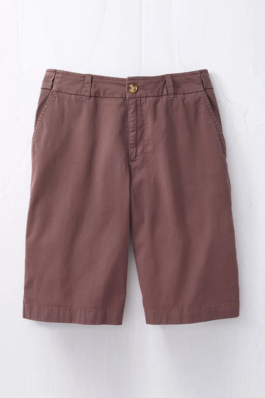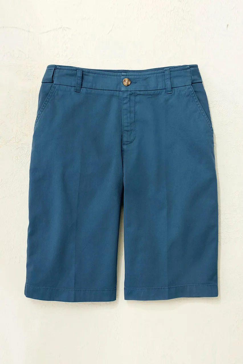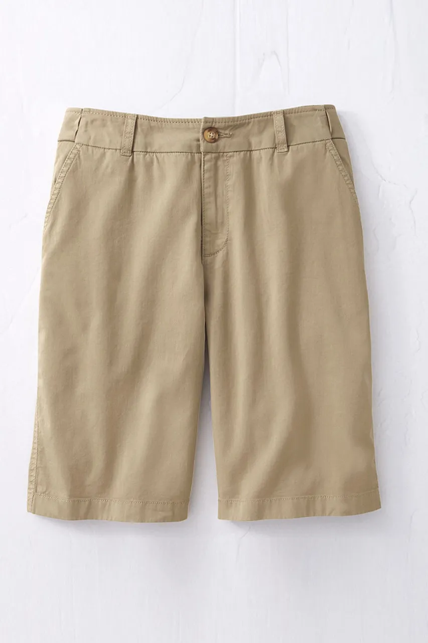 Our new lighter-weight chino shorts are so comfortable for summer �?in a full-coverage length, with hidden stretch bands that expand up to 4" at the waist. Button and fly front, with belt loops, slash pockets and one back welt pocket.