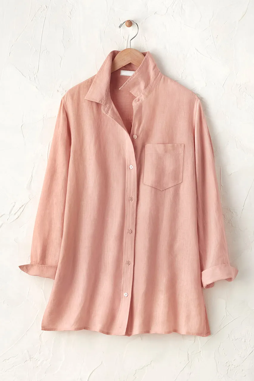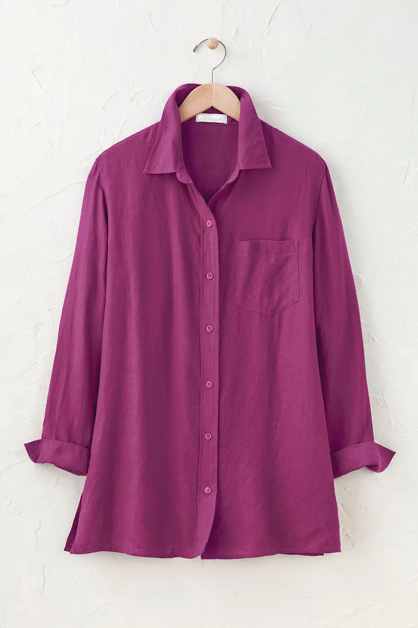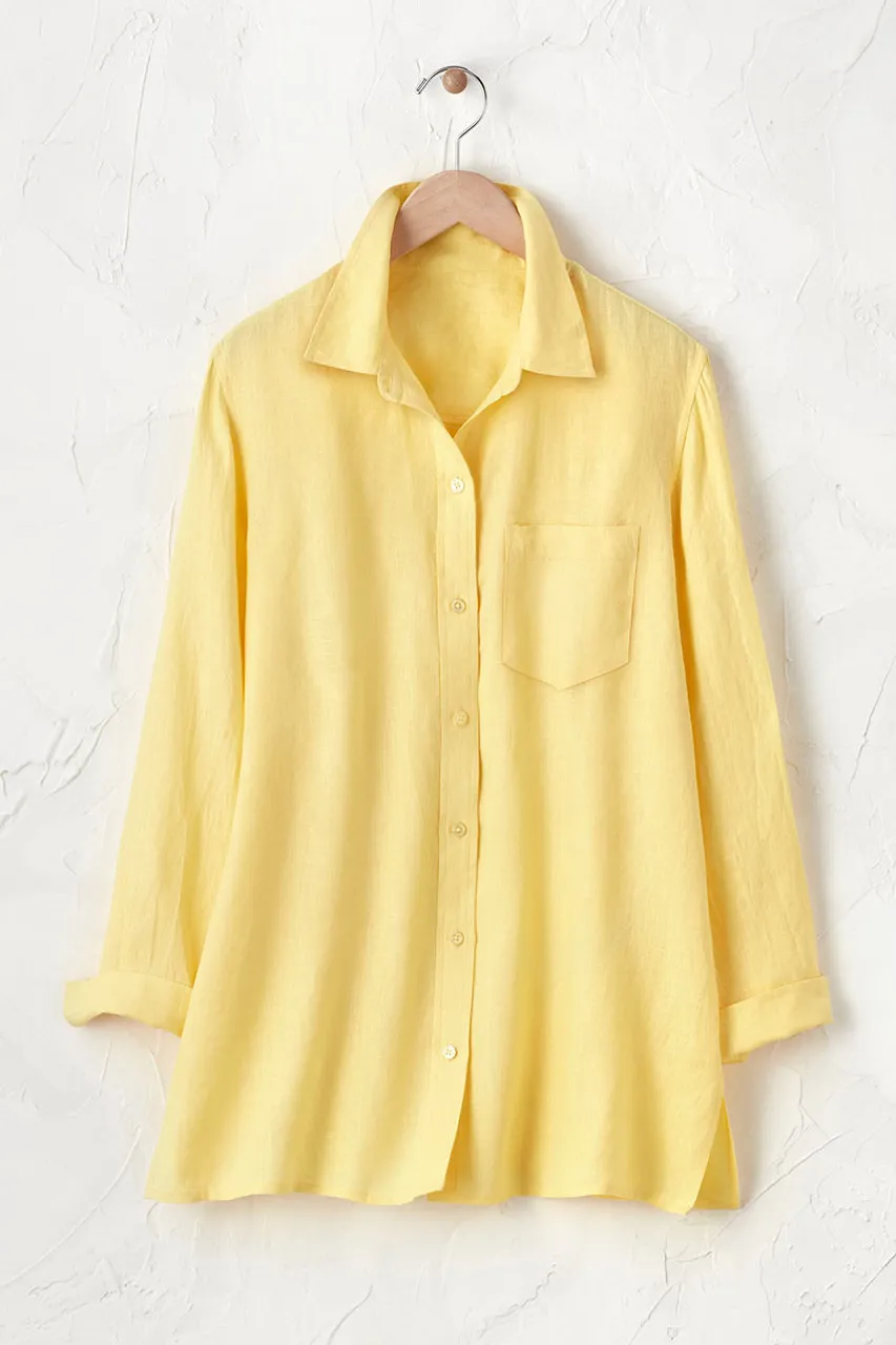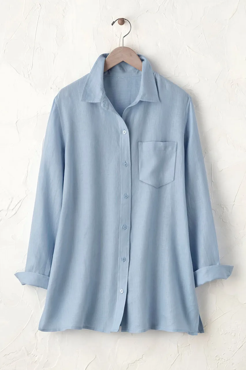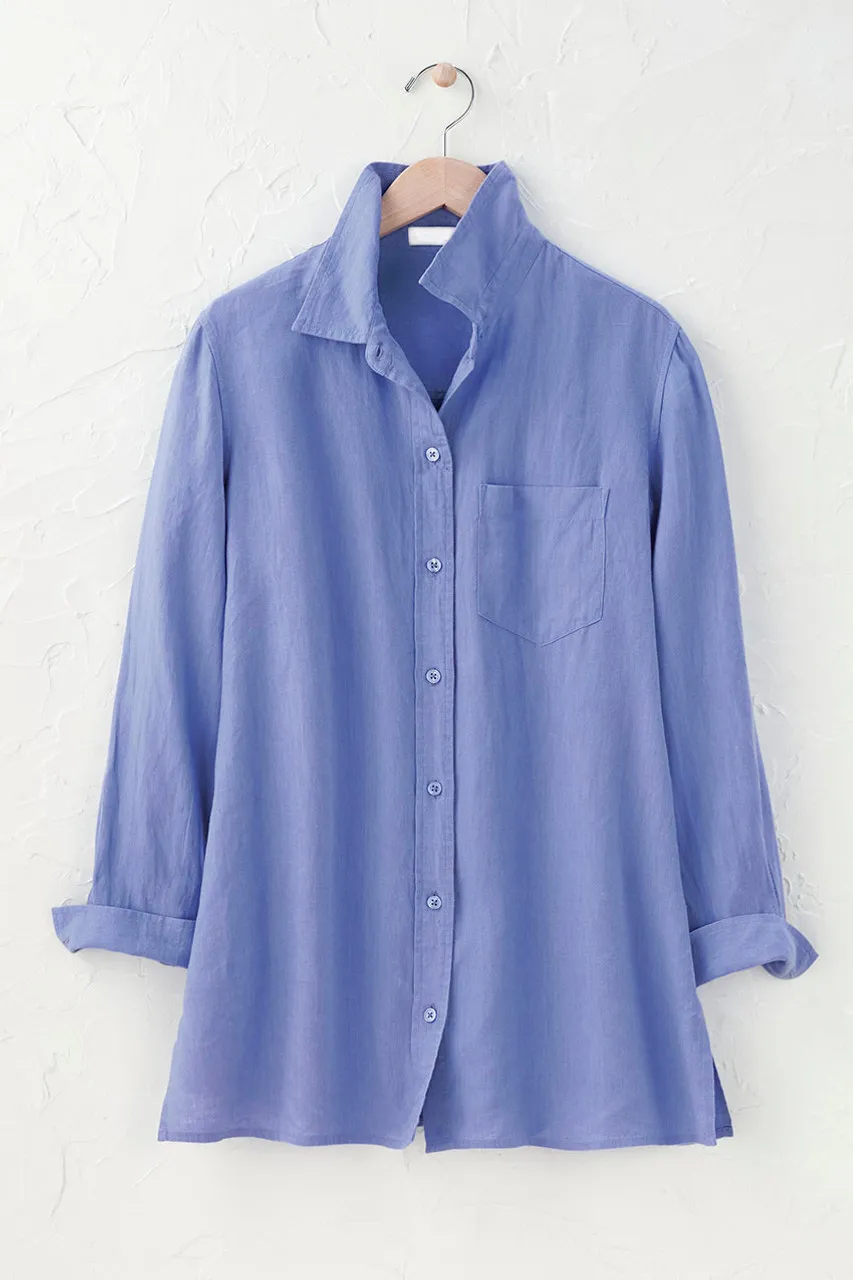 The lightweight big shirt you love, in European-grown linen – updated with a roomier fit, long sleeves and a great longer length. So it’s even easier to toss on as a top layer. or wear solo. Pleated back yoke, single chest pocket, side-slit hem.