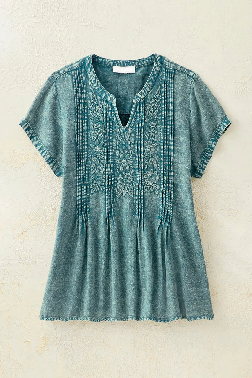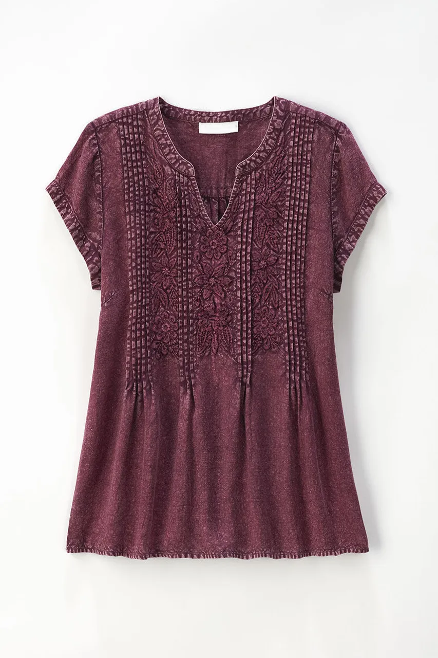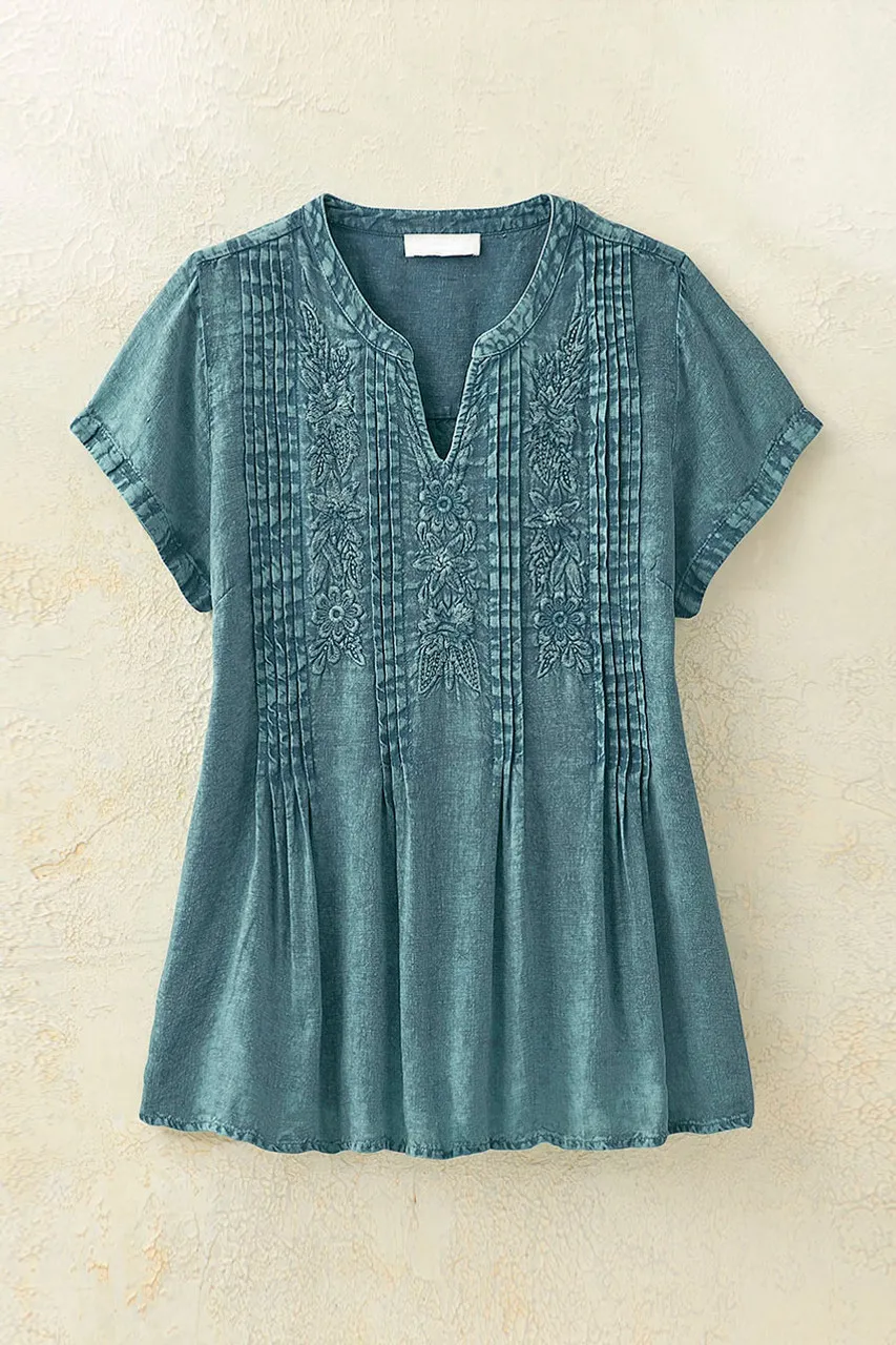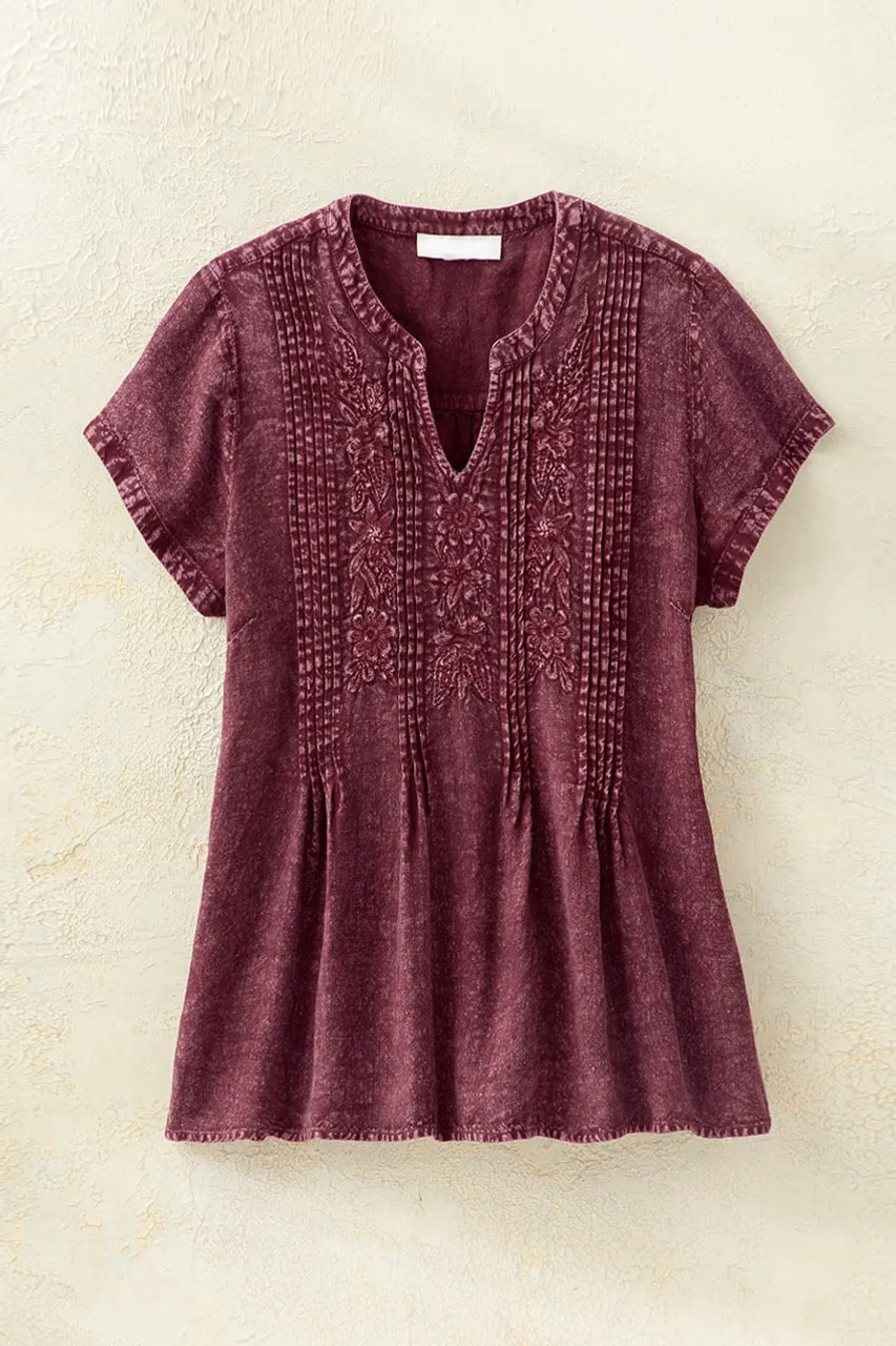 Lavish tonal embroidery and a rich vintage wash give this top a beautifully embossed look. Naturally breathable in European-grown linen, with front pintucks and shirred back yoke.