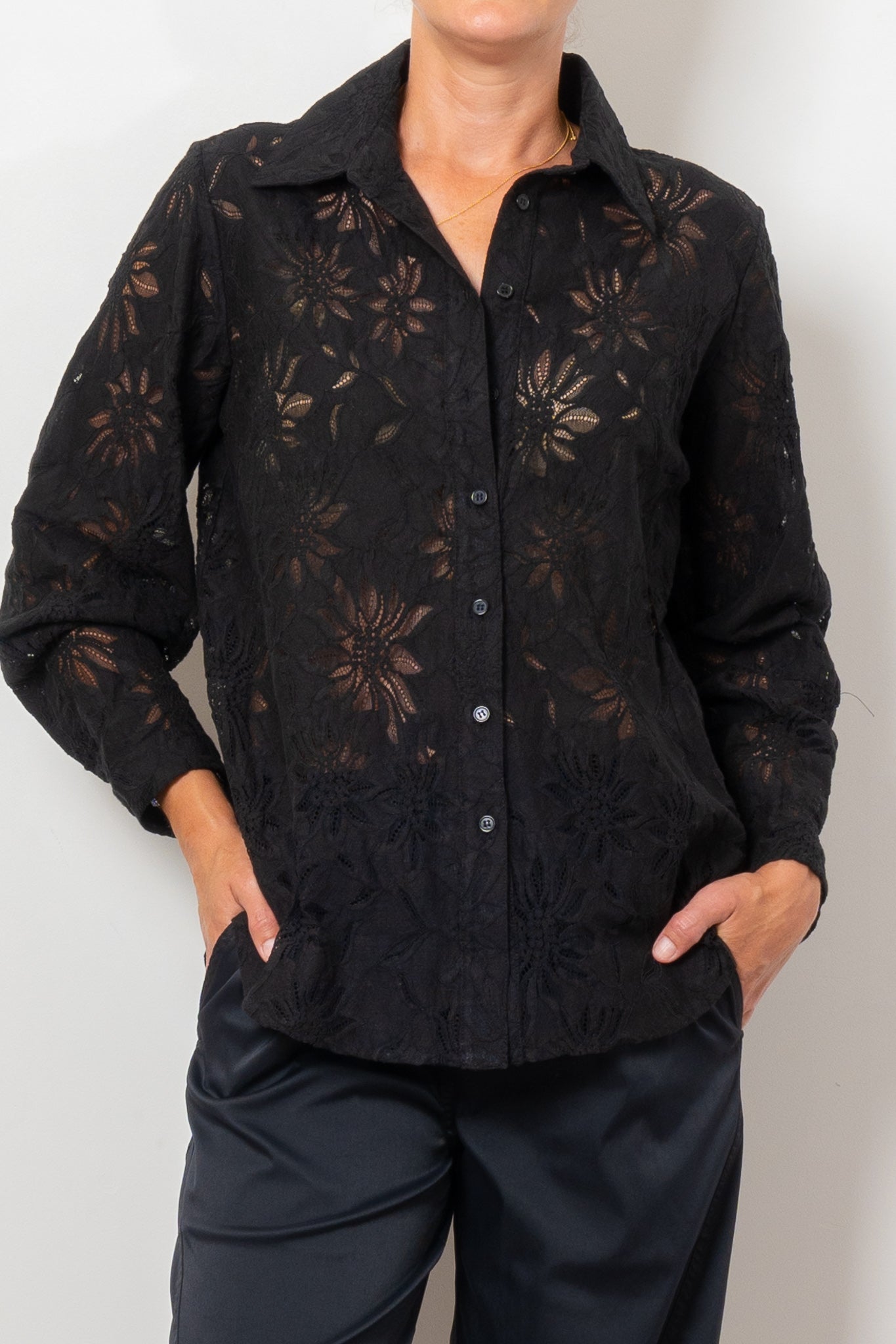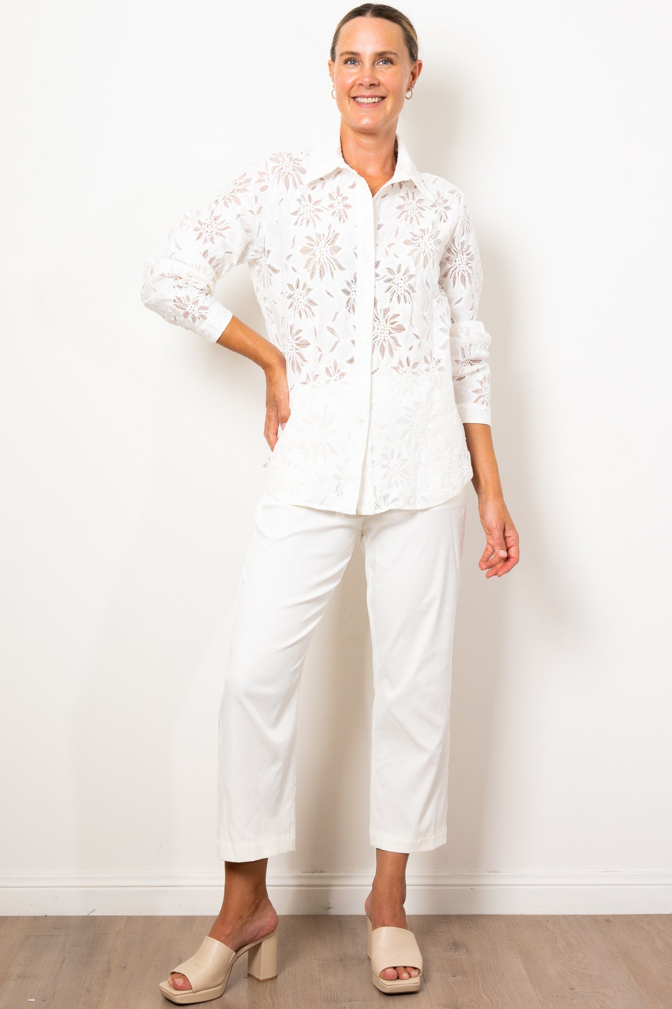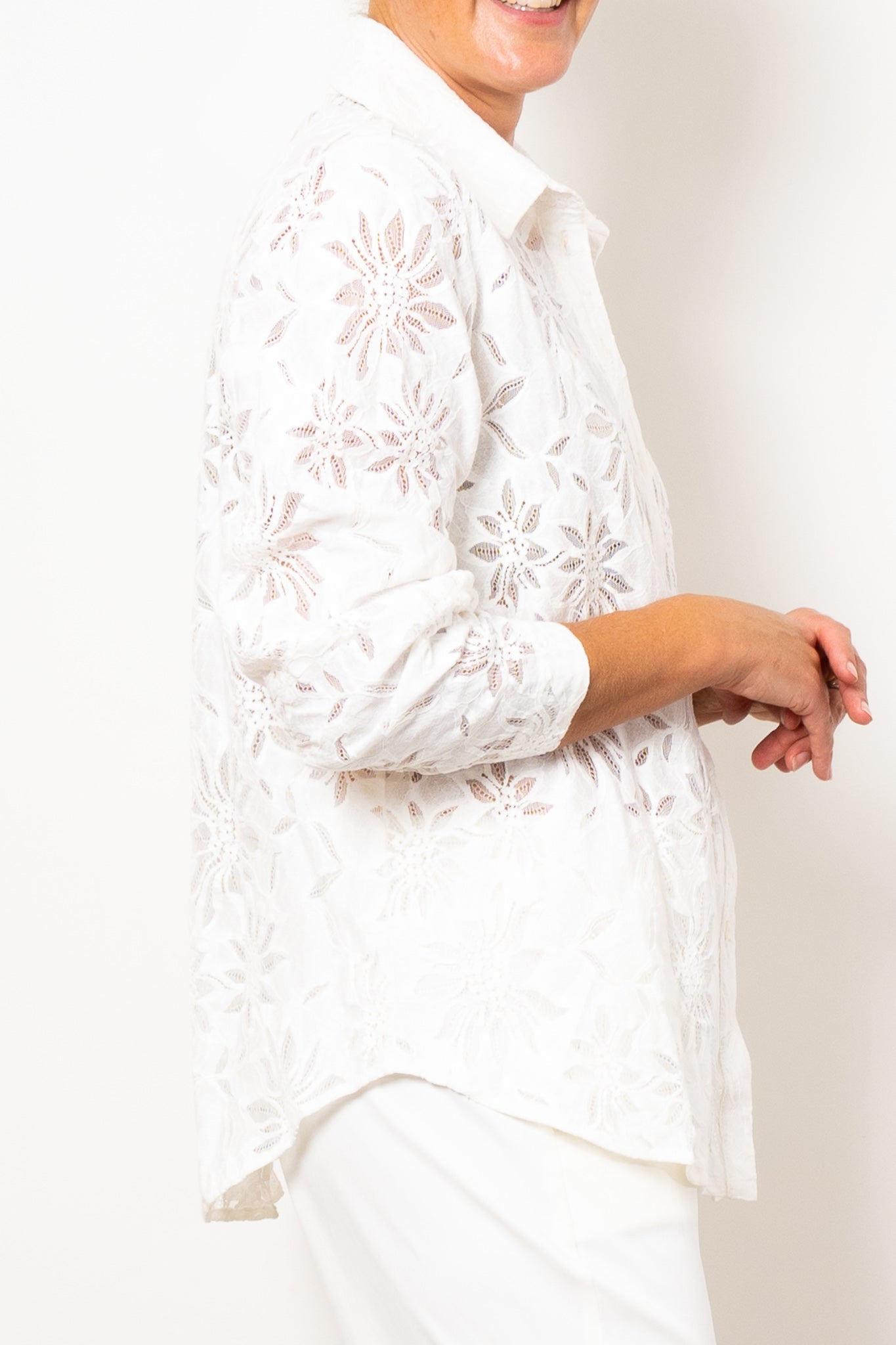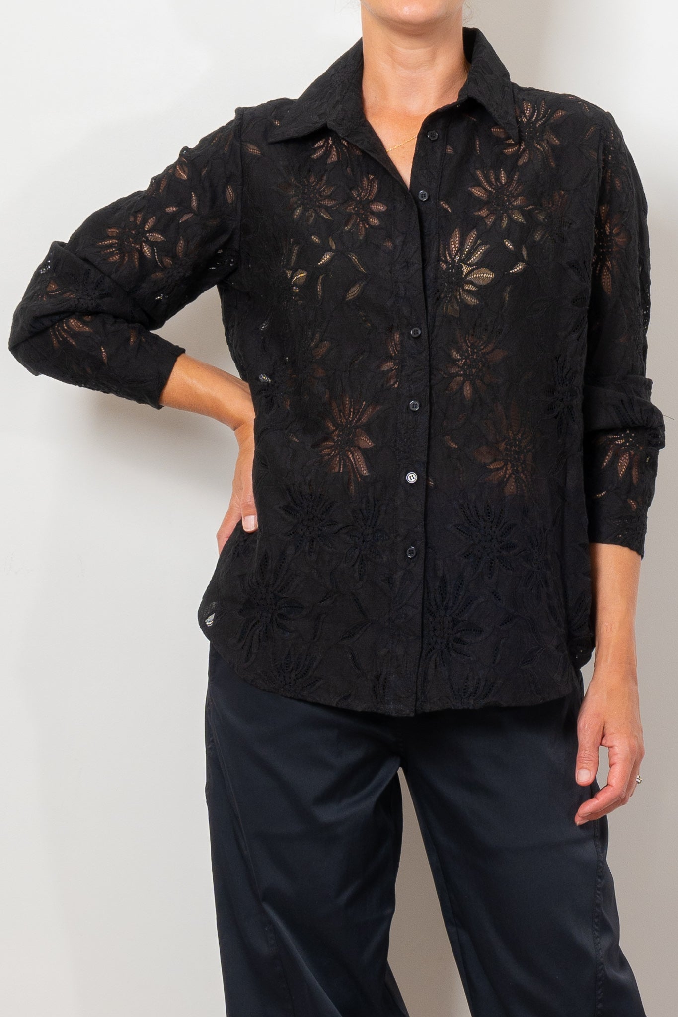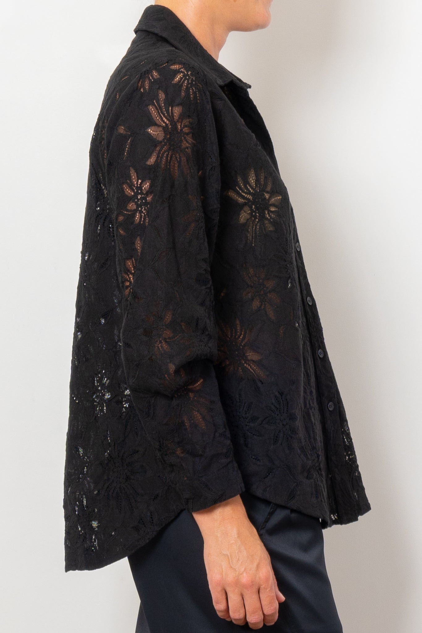 Experience the beauty and elegance of Mela Purdie's Flora Lace with the Dart Shirt. Crafted with detailed large Lace florals, this non-stretch knit shirt features a strong collar and stand, full button closure, and a curved hemline. Made in Australia, it's a modern twist on a timeless classic.